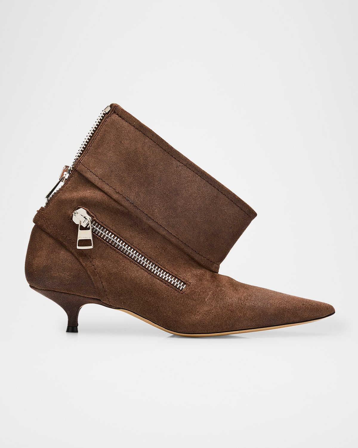 - JW Anderson slouchy suede booties with silver-tone biker-style hardware - 1.50 in / 40 mm kitten heel - Pointed toe - Back zip eases dress - Leather outsole - Lining: Leather - Made in Italy