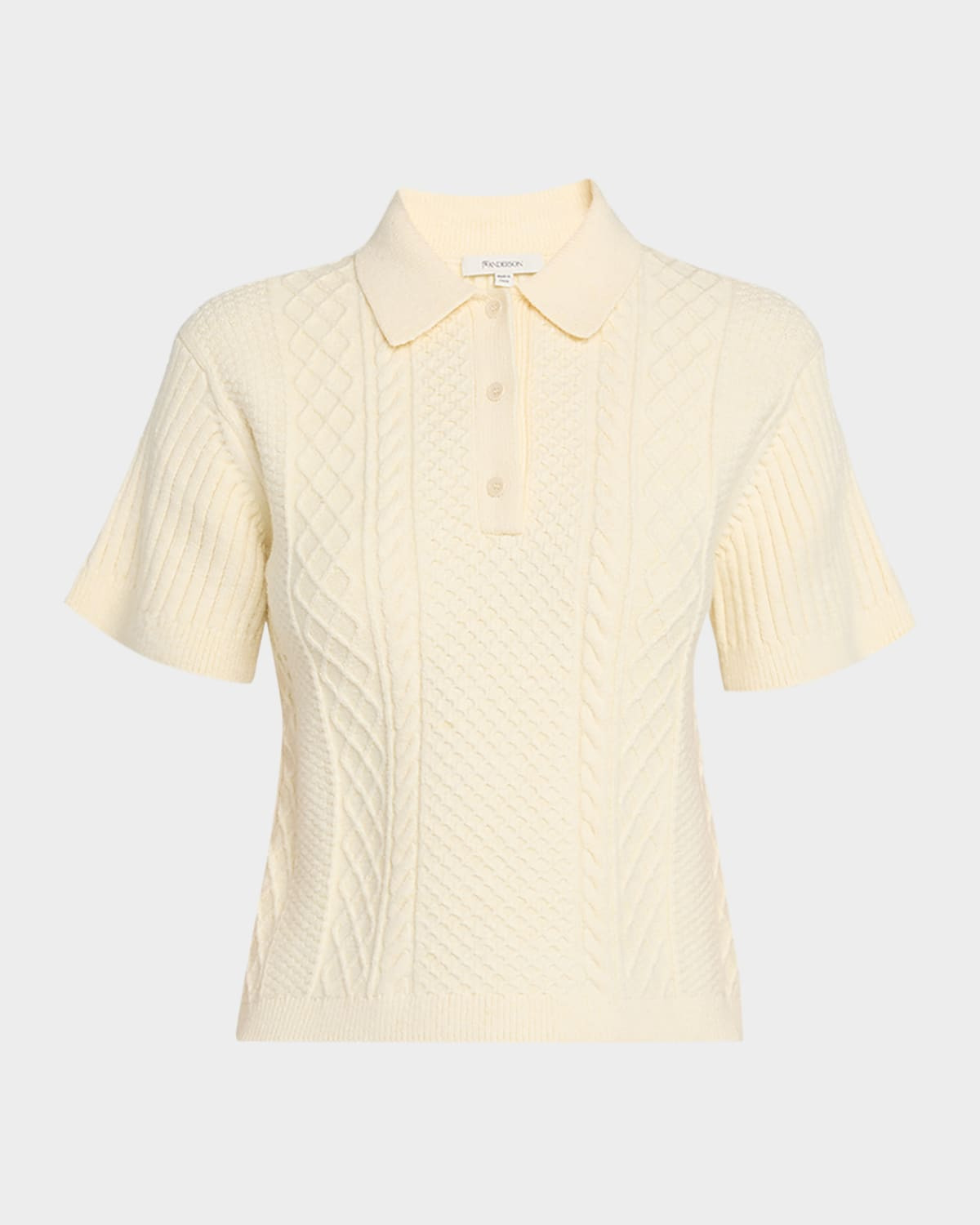 - JW Anderson polo sweater in a fisherman cable knit - Point collar; three-button front - Short sleeves - Relaxed fit - Cropped length - Ribbed cuffs and hem - Pullover style - Cotton/polyester/nylon/polyamide - Imported