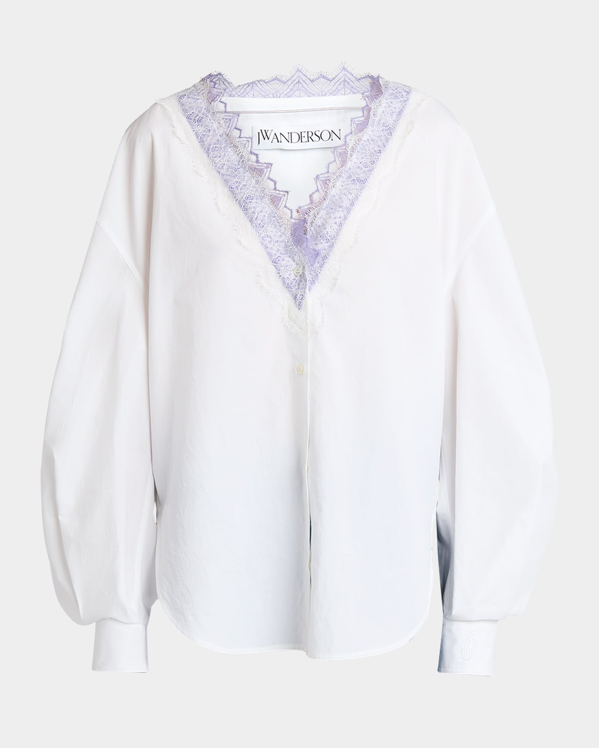 JW Anderson poplin blouse with contrast lace trim V neckline Long sleeves; button cuffs Straight fit Rounded hem Cotton Dry clean Made in Poland