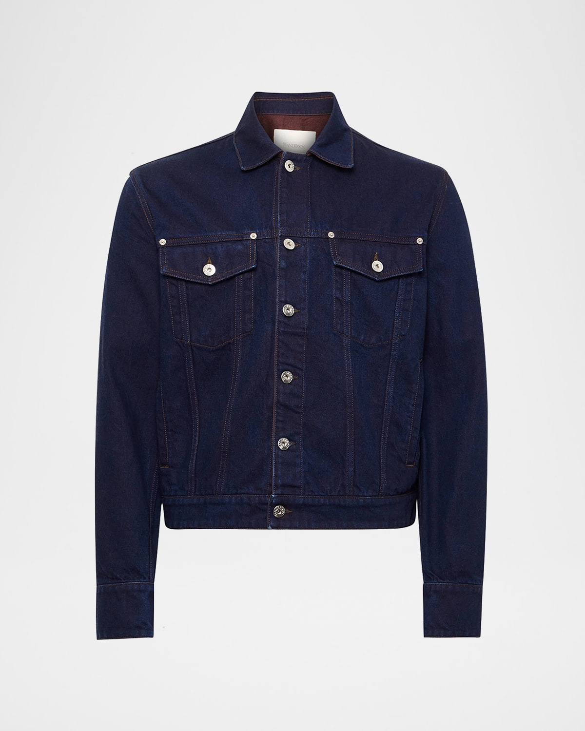 - JW Anderson trucker jacket in rich indigo denim with branded silvertone hardware - Spread collar - Button-down front - Buttoned flap pockets with rivet detail - Side welt pockets - Long sleeves - Turn-up cuffs - Cotton - Made in Portugal
