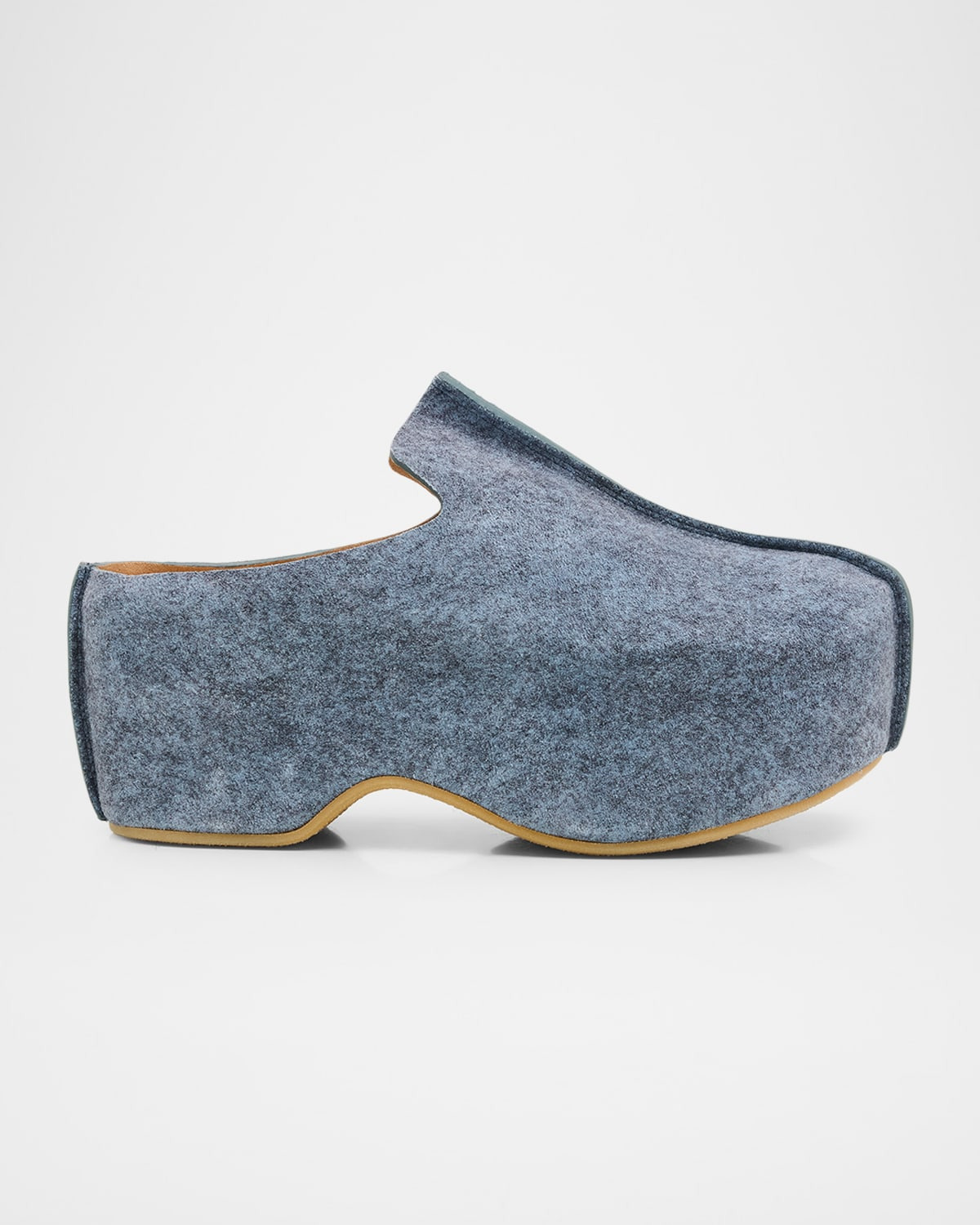 Complete with a dimensional pinched seam bisecting the vamp, these chunky clogs by JW Anderson are crafted from blistered calf suede 2.50 in / 65 mm platform heel Round toe Notched vamp Easy slide style Molded suede footbed Covered suede midsole Leather outsole Made in Italy