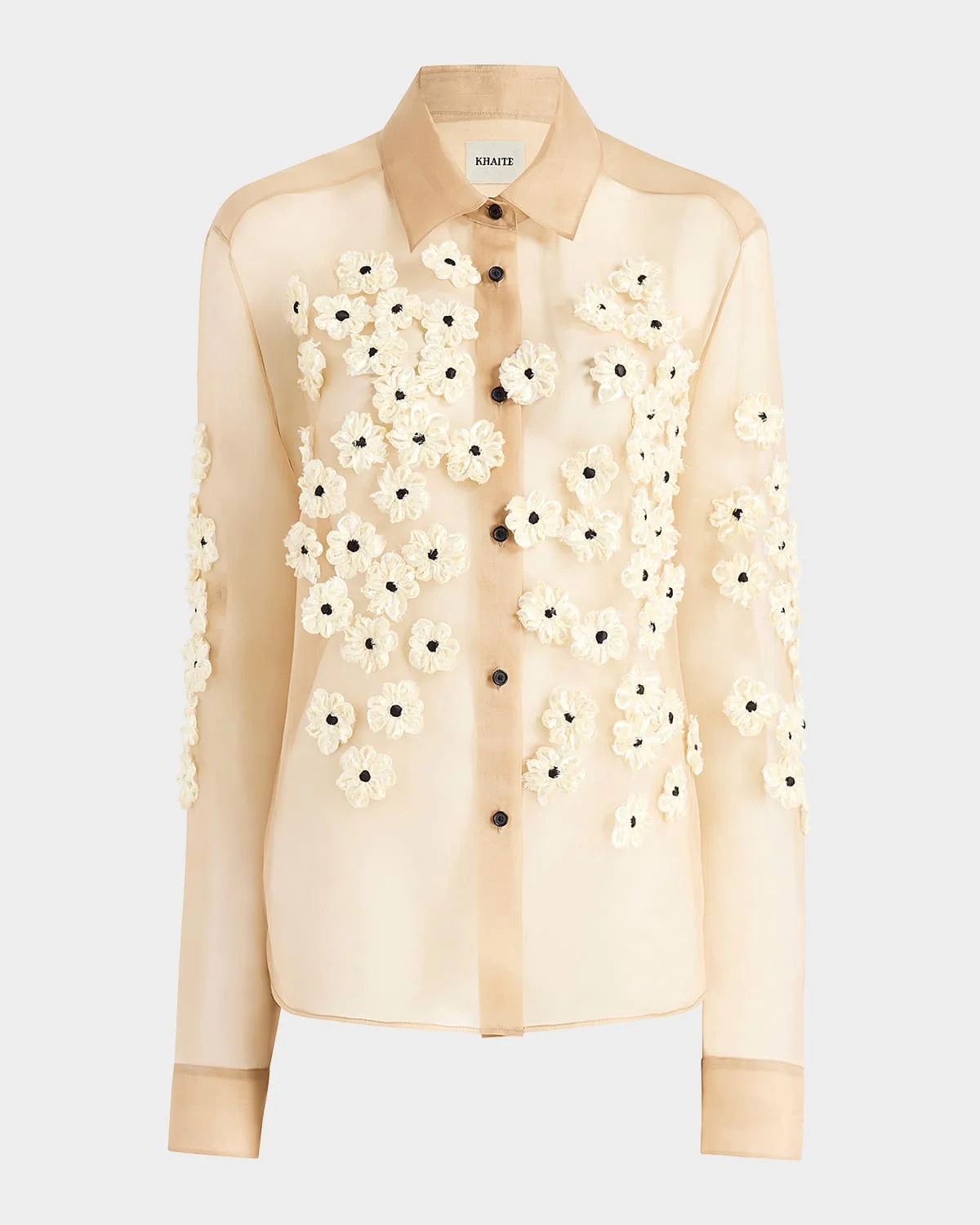 Crafted from sheer silk georgette, the "Argo" top & nbsp;from Khaite features eyelash fringed silk floral applique Point collar; button front Long sleeves; button cuffs Loose fit Hem falls below the hip Straight hem Silk/silk Dry clean Made in USA