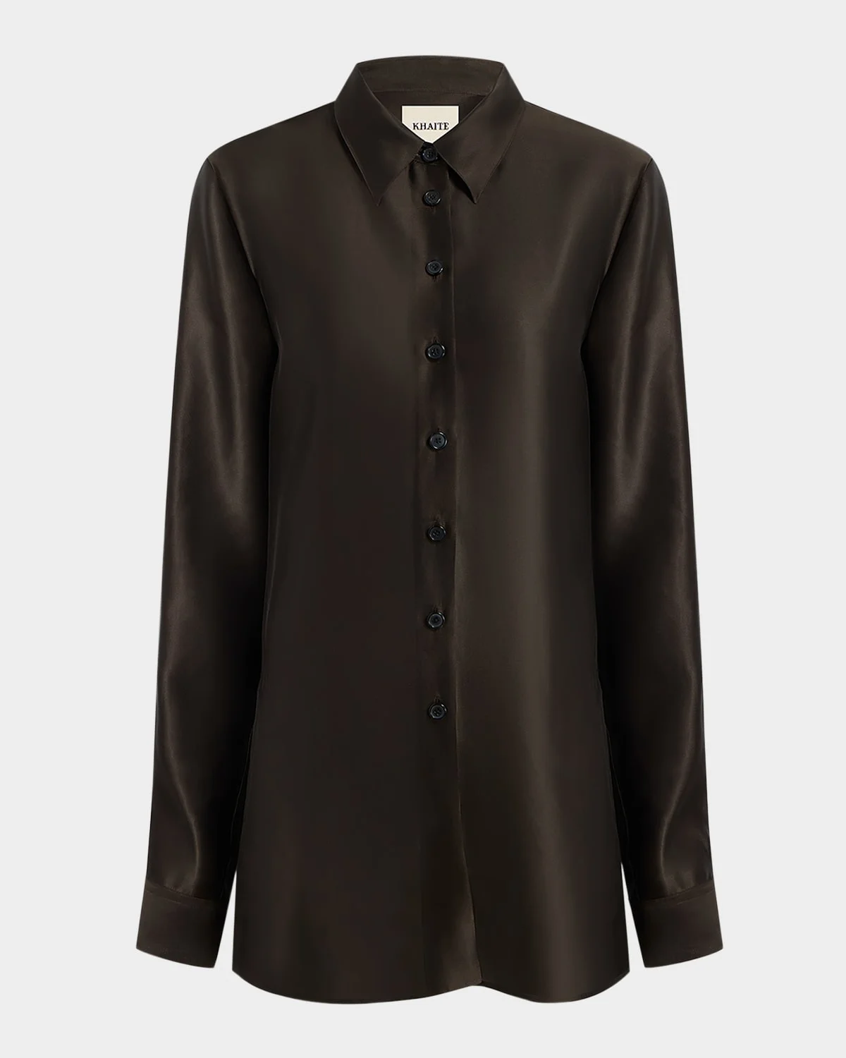 The "Auryn" menswearinspired top from Khaite is crafted in silky Italian twill, designed for crisp character and fluid drape Point collar; button front Long sleeves Button cuffs Boxpleated back yoke Relaxed fit Viscose/silk Dry clean Made in the USA