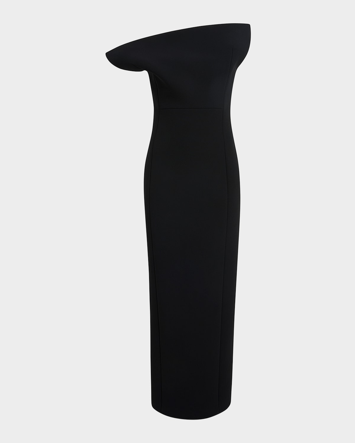- Khaite wool-blend dress enhanced with an architectural strapless neckline - Sleeveless - Column silhouette - Full length; walking vent - Center back zip - Polyester/virgin wool/silk - Dry clean - Made in USA