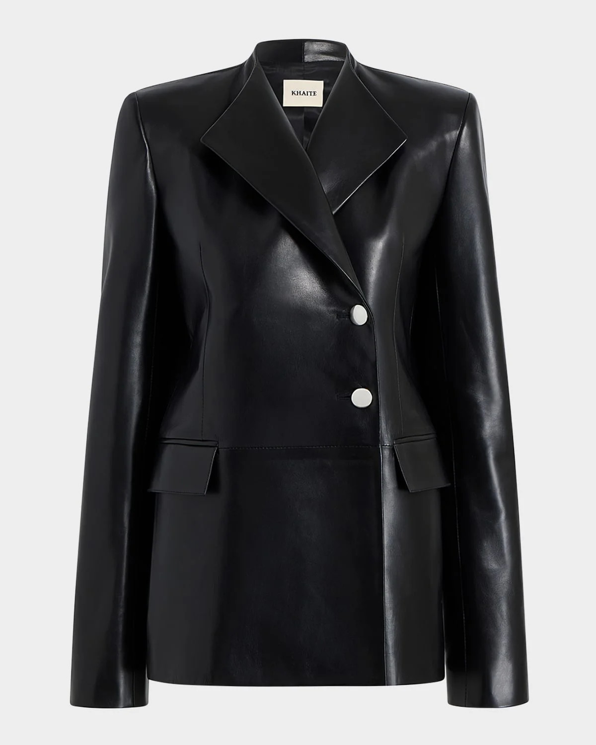 Khaite "Elona" jacket is tailored in a shiny lambskin leather adorned with silvertone buttons Peak lapels; doublebreasted front Long sleeves; button cuffs Padded shoulders Hip flap pockets Straight fit Hem falls below the hip Leather Dry clean Made in France