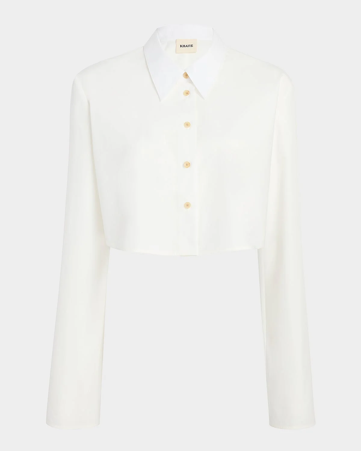 Crafted from crisp cotton, this "Fritz" top from Khaite features a high-low cropped hem and a layered ruffle back detail Point collar; button front Long sleeves Button cuffs Layered back yoke Cropped style Boxy fit Cotton Dry clean Made in Italy