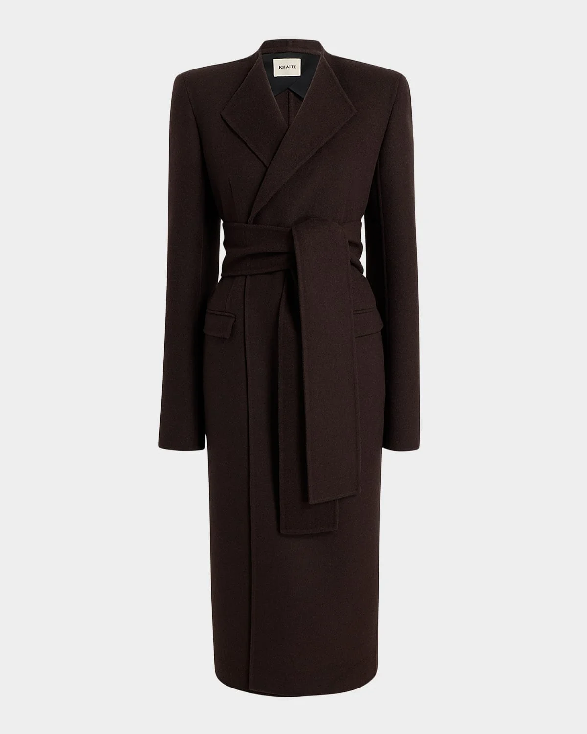 The "Jelson" coat from Khaite is crafted in doublefaced wool, finished with clean lines and a detachable waist selftie for a customizable fit Upper body lined with cupro twill Stand collar; wrap front Long sleeves Front flap pockets Hem falls below the knee Straight silhouette Wool Dry clean Made in Italy