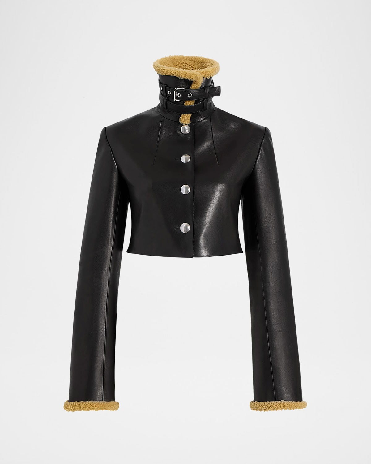 Crafted in smooth leather, the "Jodie" jacket from Khaite is detailed with dyed shearling (United States) trim and an adjustable belt strap on the collar. Vertical darts and metallic buttons add a refined finish. Stand collar Button front Long sleeves Button cuffs Cropped style Slim fit Leather/shearling Dry clean Made in the USA