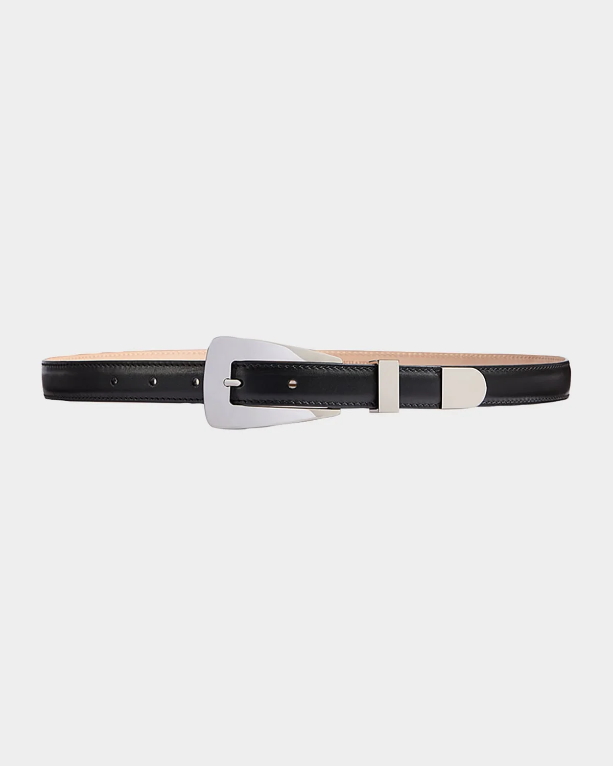 Crafted from sleek calfskin leather, this Khaite "Lucca" belt features an elongated trapezoidal buckle, loop, and curved tip in palladium-plated brass. Adjustable fit Prong closure Cut to size Leather Specialist clean Made in Italy