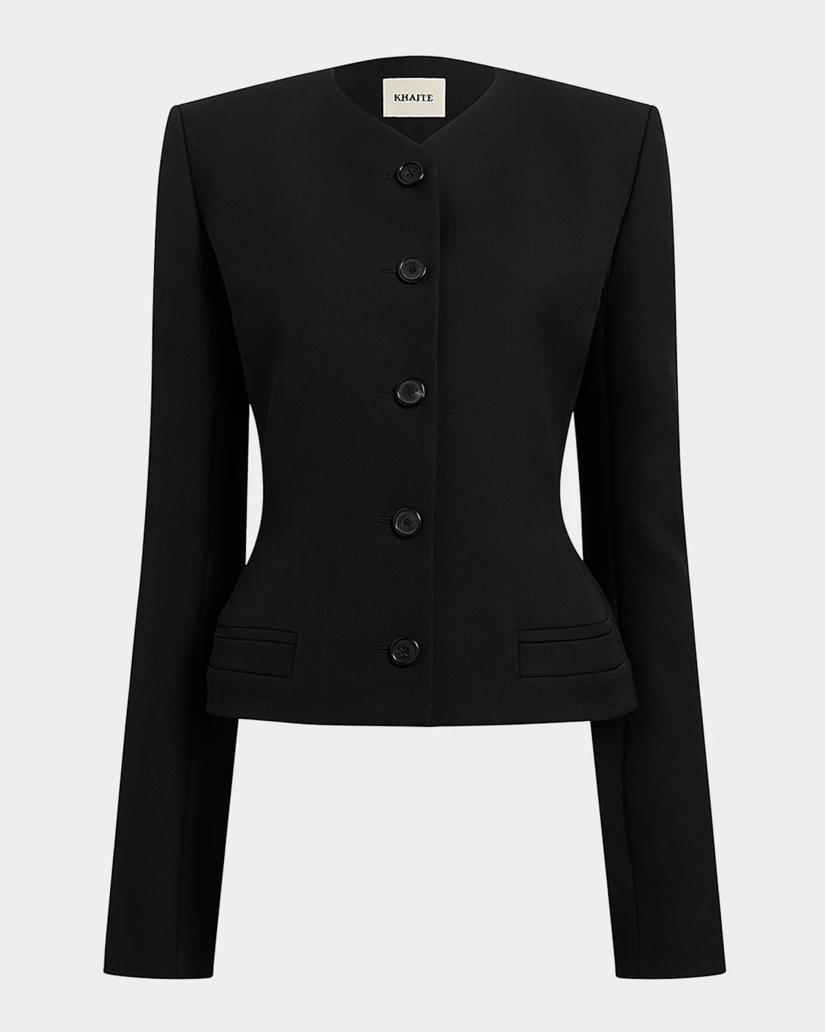 Khaite's "Nara" jacket is expertly tailored from pure wool with a cinchedin waist for a flattering fit Collarless neckline; button front Long sleeves; button cuffs Front welt pockets Fitted Hip length Wool Dry clean Made in USA