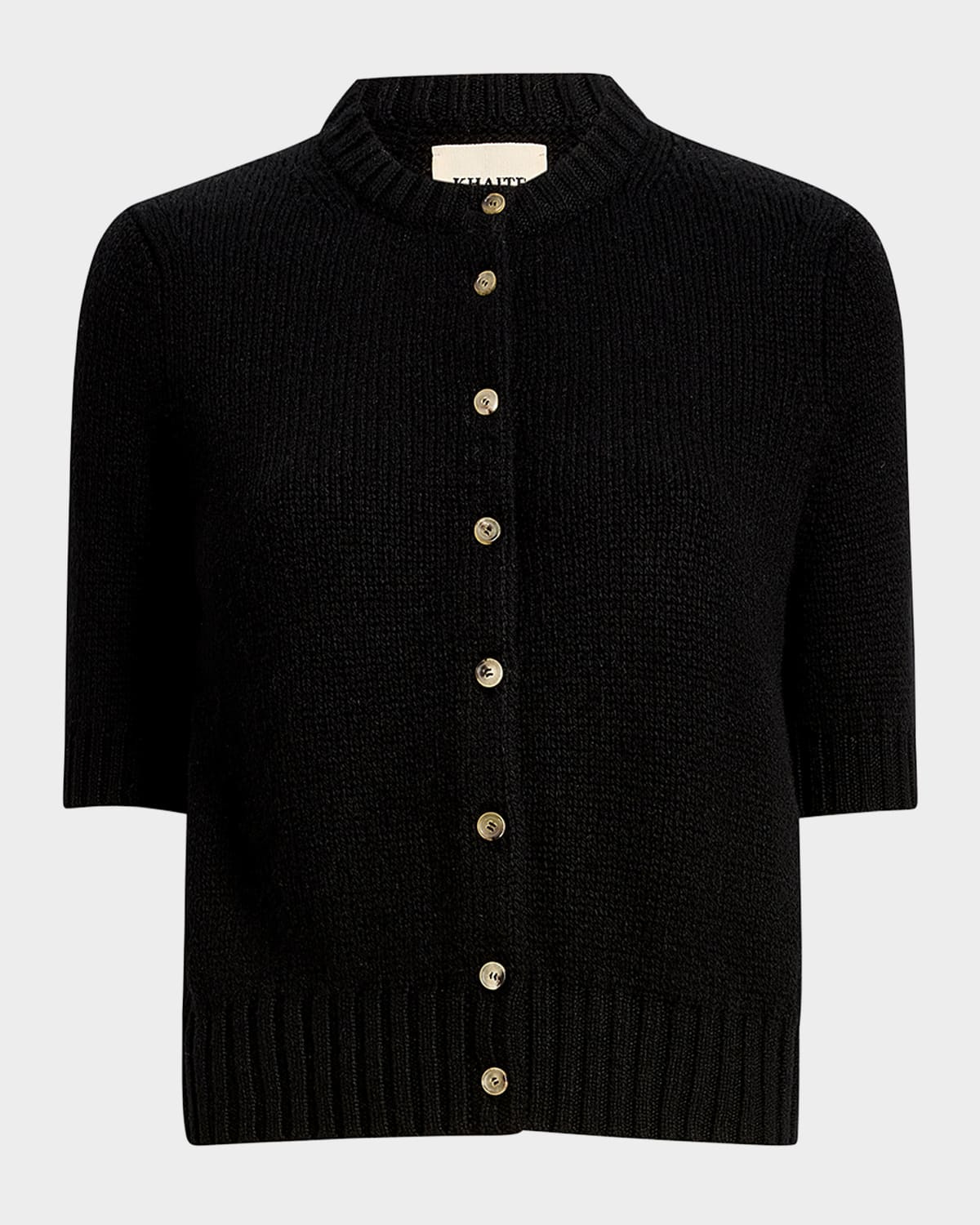 - Khaite "Nora" knit button-front cardigan in cashmere - Crew neckline - Short sleeves - Ribbed trim - Cashmere - Hip length - Relaxed fit - Dry clean - Imported - Model is 5'10"/177cm.