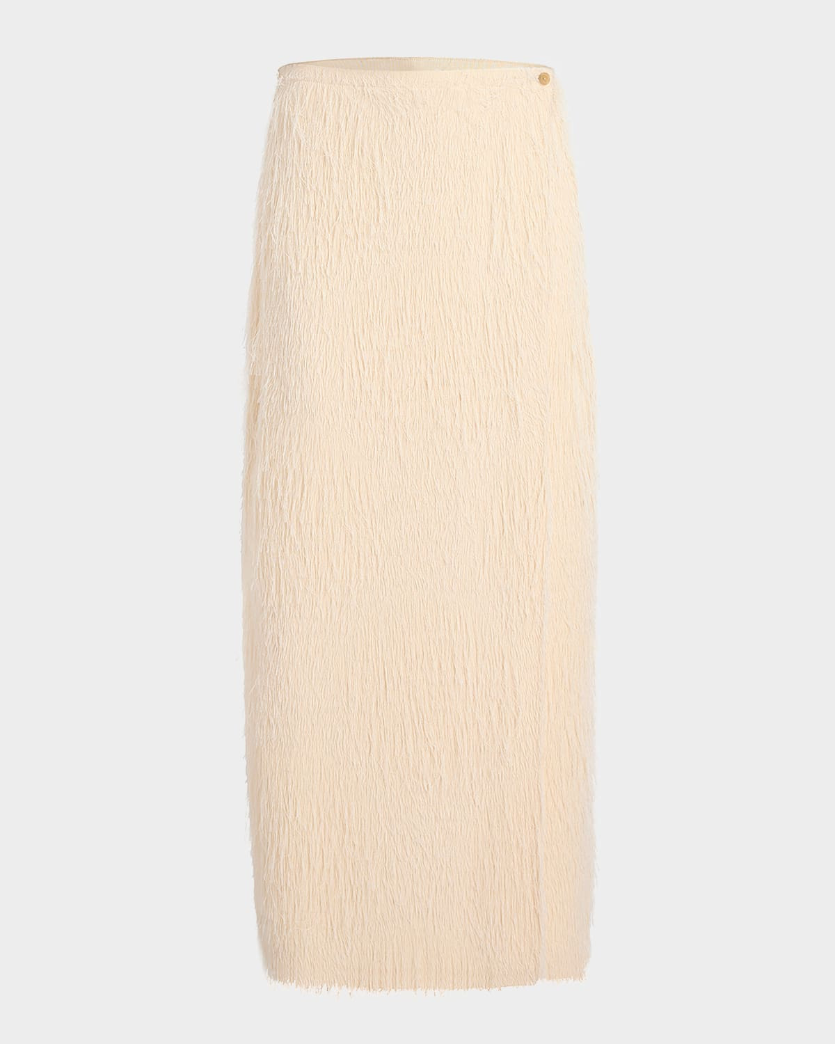 - Khaite "Quinn" wrap skirt in a tiered fringe knit - Mid waist - Ankle length - Skirt falls straight from hip to hem - Button side closure - Acetate/viscose - Dry clean - Made in USA