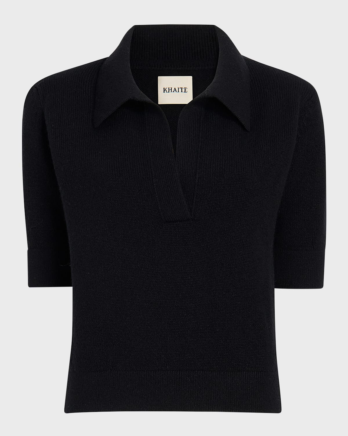 Khaite "Shrunken Jo" knit polo sweater with ribbed trim Openneck spread collar Elbowlength sleeves; drop shoulders Relaxed fit Pullover style Cashmere/elastane Imported