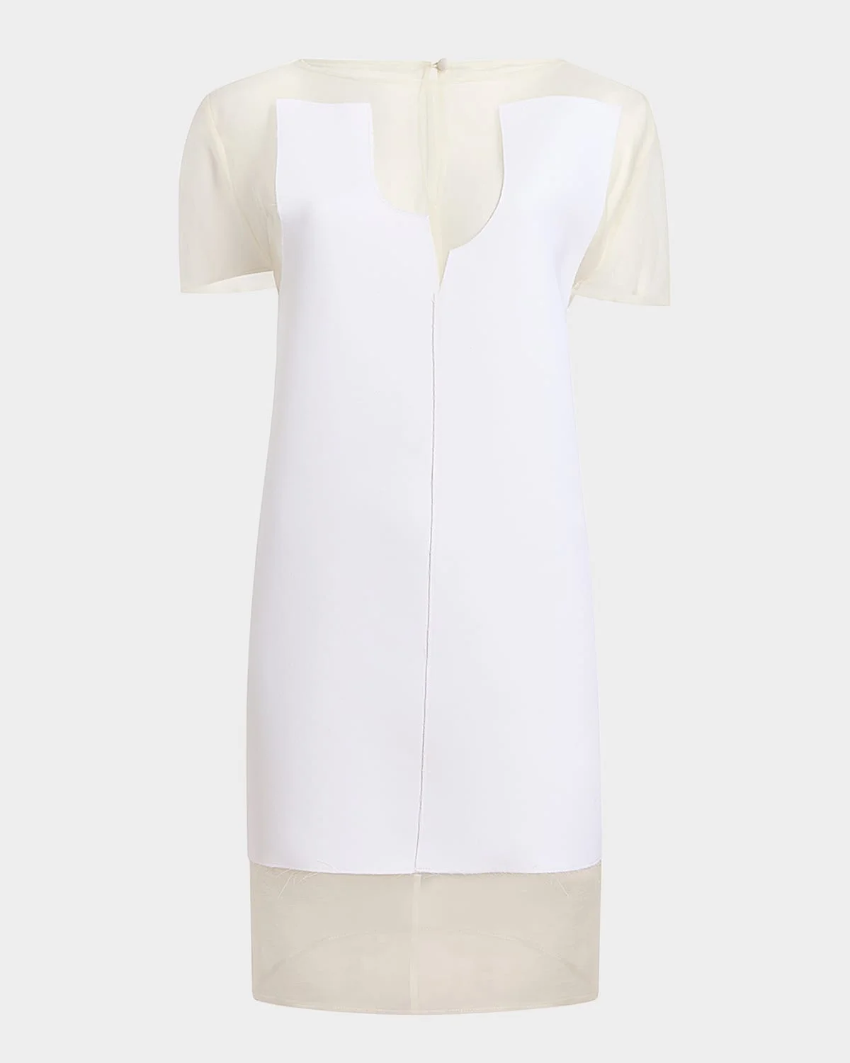 - Khaite "Winona" paneled dress with a sheer neckline - Boat neckline; button/open-back - Short sleeves - Mini length - Shift silhouette - Polyester - Dry clean - Made in Italy