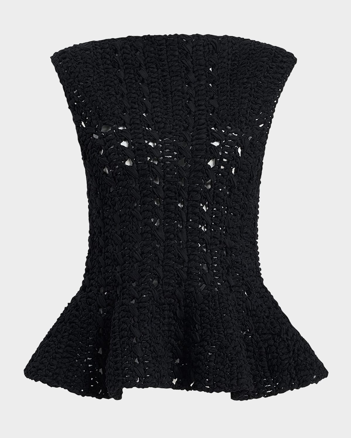 - Khaite "Yuka" hand-crocheted top crafted from lightweight cotton gauze - High neckline - Sleeveless - Fitted - Peplum hem - Pullover style - Cotton/nylon/polyamide - Dry clean - Made in USA