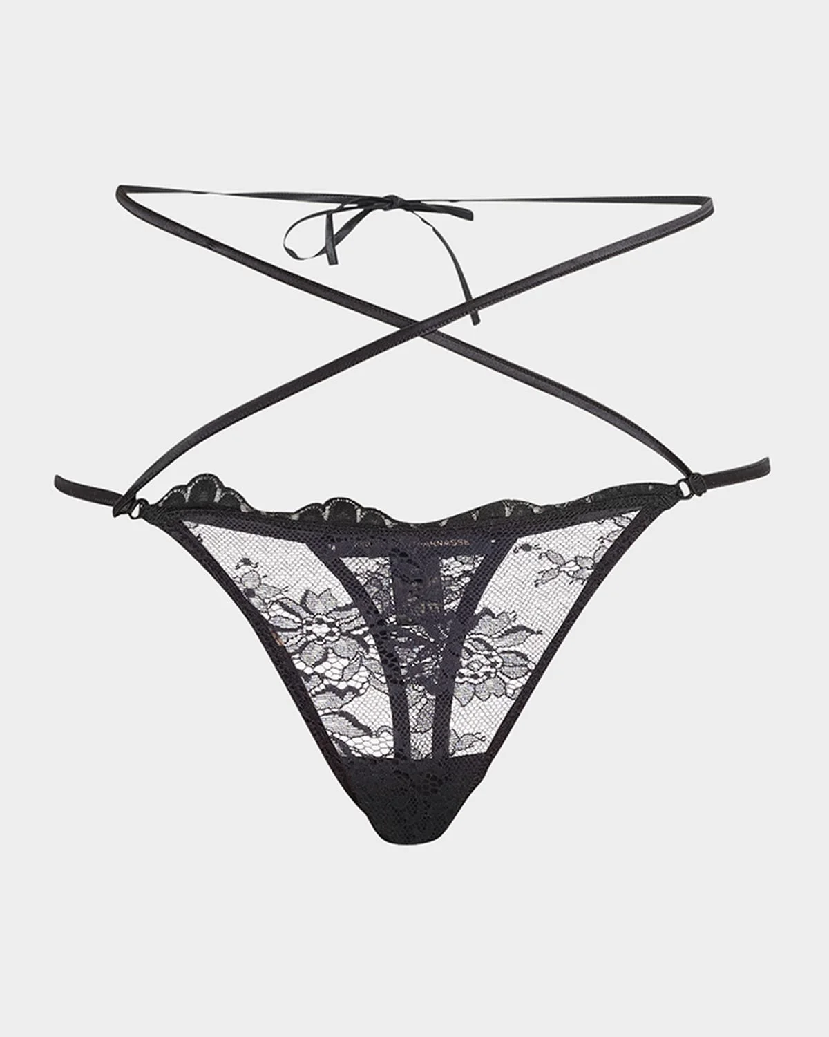 Kiki De Montparnasse "Jolie" lace thong with criss-cross straps Low-rise sits across the hips Soft ties at mid-back Adjustable side straps Minimal seat coverage Nylon Hand wash Made in the USA from imported materials Model is 5'10"/177cm.