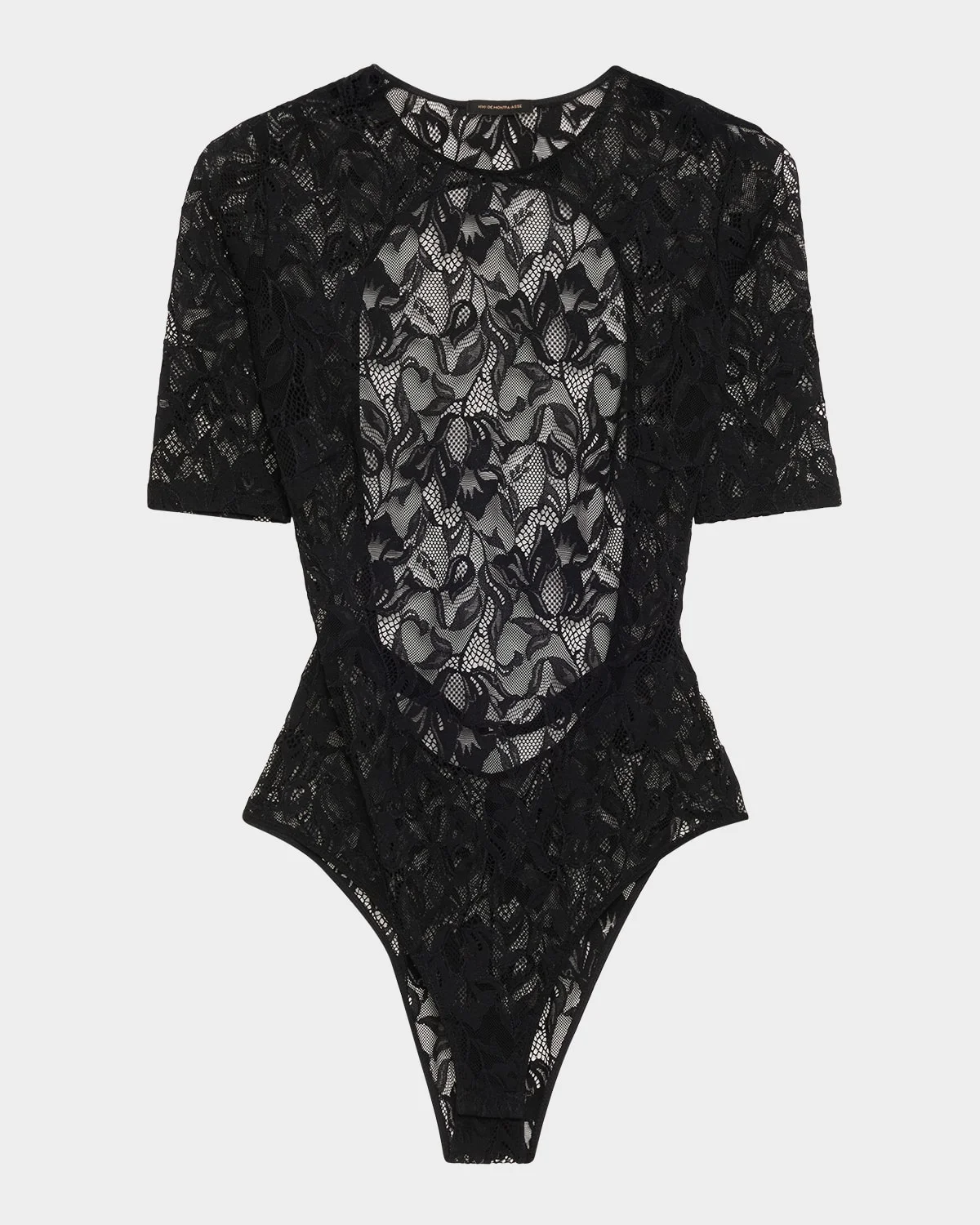 This Kiki De Montparnasse "Sophie" bodysuit is crafted in modern and alluring French Stretch Textronic Lace. The cutout open back is embellished with a sleek band to cinch the waist. Crew neckline Short sleeves Open back Highcut legs Formfitting Minimal seat coverage Snap gusset Nylon/polyamide/elastane Imported
