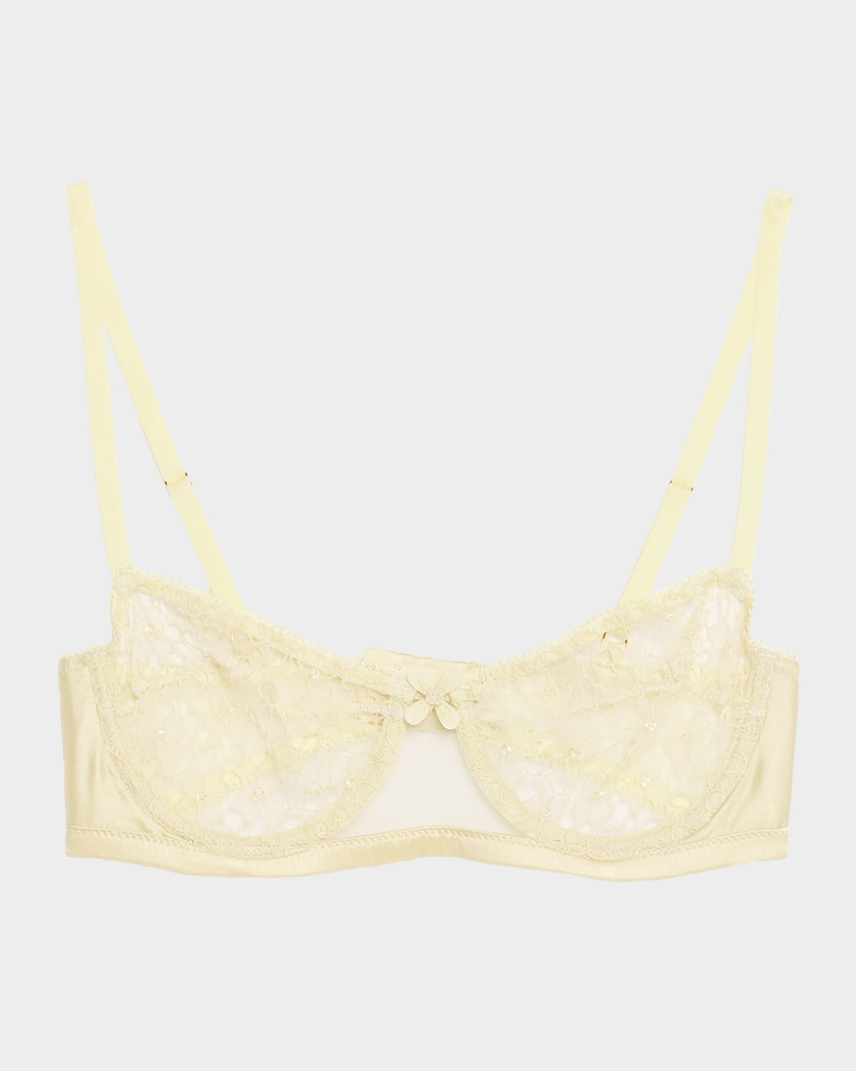 Kiki De Montparnasse "Vinca" balconette bra in floral French lace and silk stretch charmeuse, glittering with beaded accents Underwire twopart cups Adjustable shoulder straps Flower embellishment on the center gore Hookandeye back closure Cotton/nylon/polyamide/silk Dry clean Made in the USA