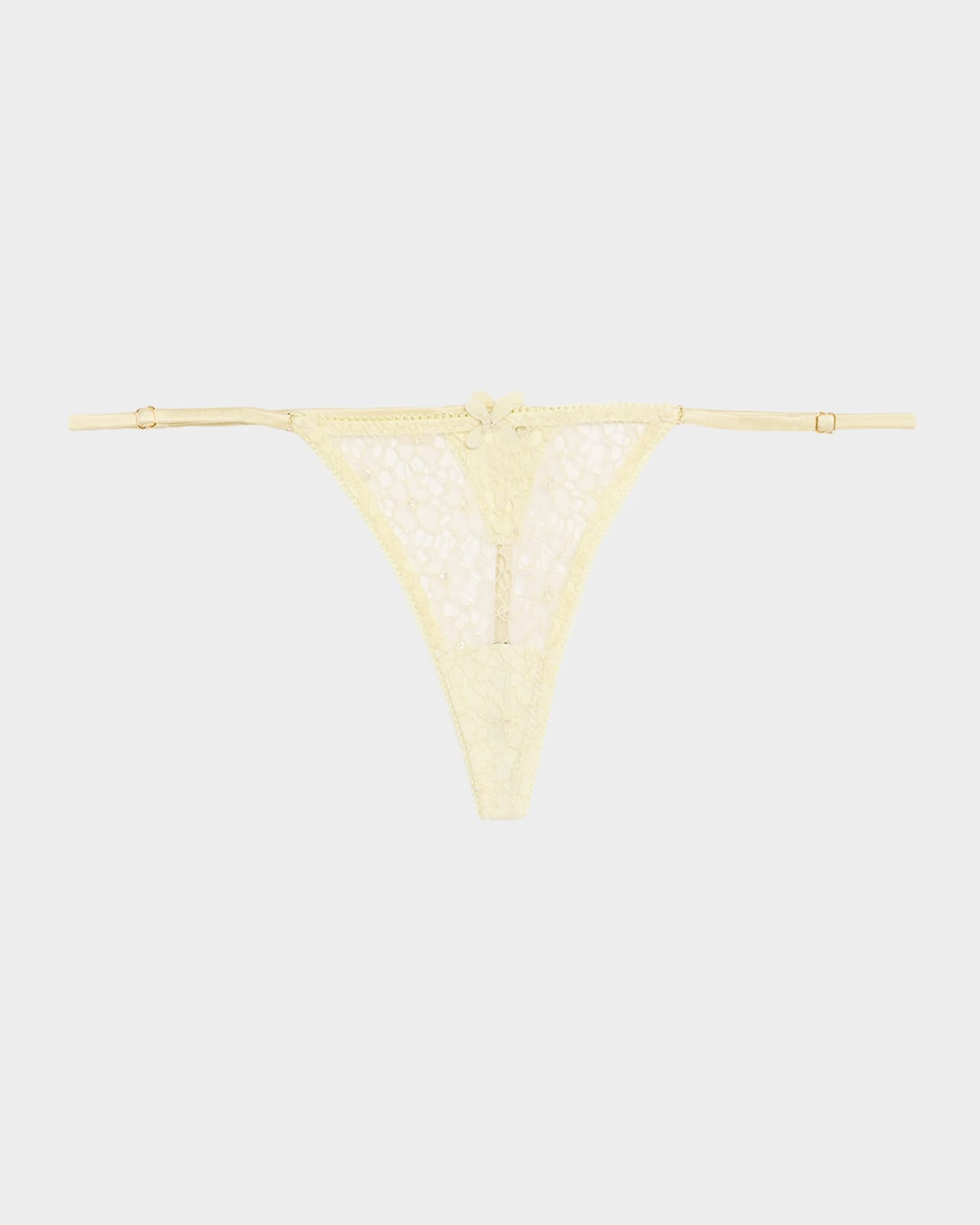 Kiki De Montparnasse "Vinca" gstring in French lace and silk charmeuse, decorated with glittering beads Lowrise sits low on the hips Adjustable side straps Minimal seat coverage Cotton/nylon/polyamide/silk Dry clean Made in the USA