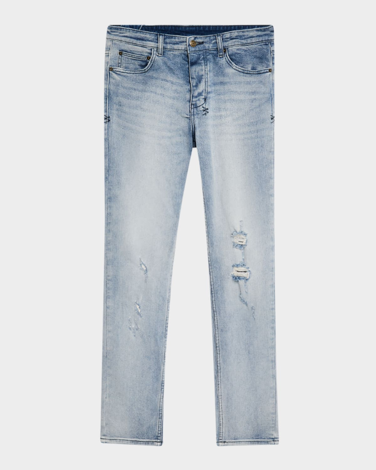 - Ksubi "Chitch Philly" jeans in distressed heavy-duty stretch denim. - Featuring box logo and branded contrast stitching. - Five-pocket style; clean back pockets. - Skinny, narrow fit from knee to ankle. - Button/zip fly; belt loops. - Cotton. - Machine wash. - Imported.