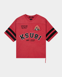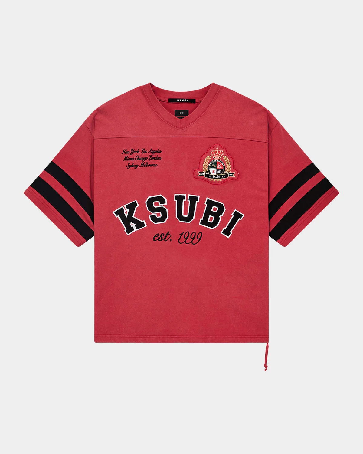 The Ksubi "Duke" tshirt is made from heavyweight cotton jersey, with multitextural artwork throughout. Vneckline Exaggerated dropped shoulder Short sleeves with double stripes Signature ratstail Tbox branding and back 4x4 crosses Slightly cropped Pullover style Oversized fit Cotton Machine wash cold Imported