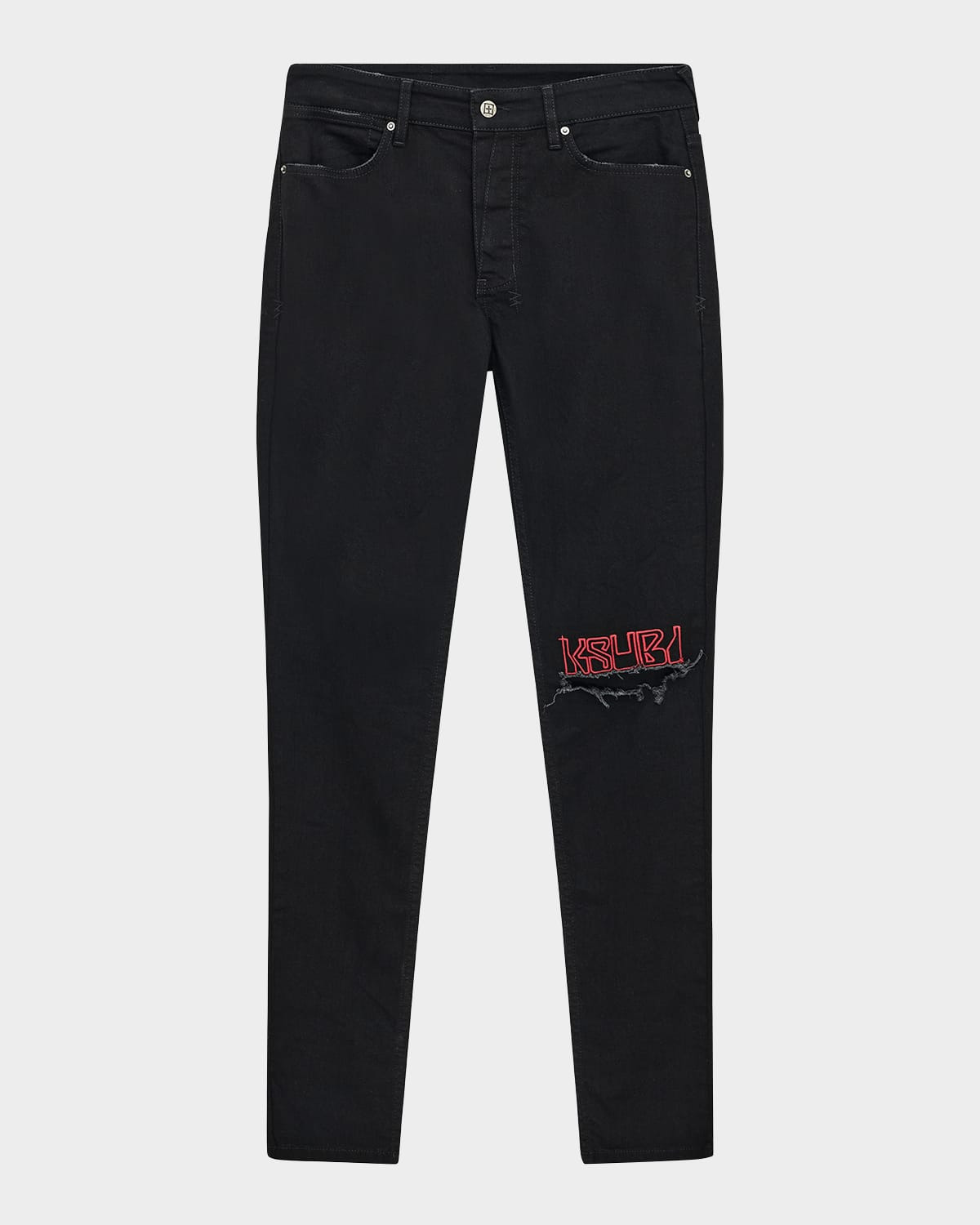 - Ksubi jeans made from premium comfort stretch denim in a black wash - Logo detailing with distressing on the left thigh - Regular rise - Five-pocket style - T-box and 4x4 embroidery - Signature woven pocket tag - Slim fit through skinny leg - Full length - Button-zip fly; belt loops - Branded hardware - Cotton/elastane - Machine wash cold, wash inside out - Imported