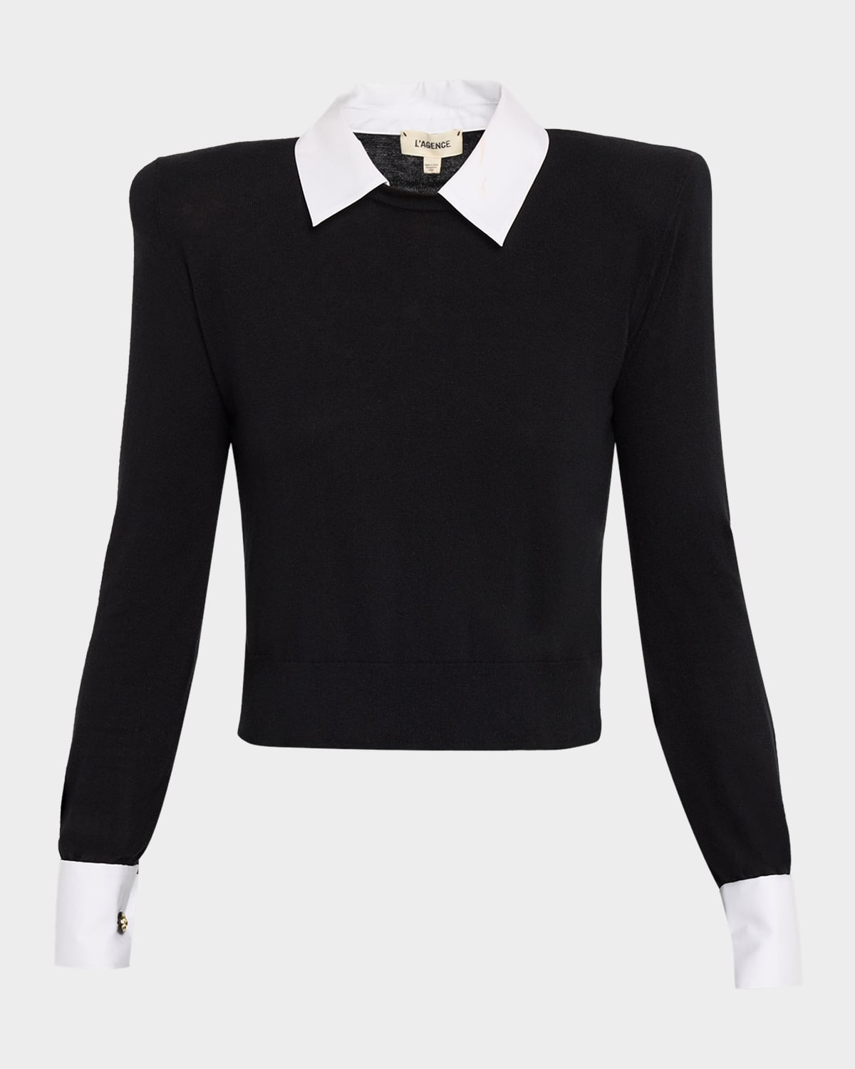 - L'Agence "April" top featuring a contrasting collar and cuffs in a cotton-blend - Point collar - Strong shoulders - Long sleeves; button cuffs - Easy fit - Hem sits at the hip - Pullover style - Cotton/Amni® nylon/spandex - Imported - Model is 5'10"/177cm.