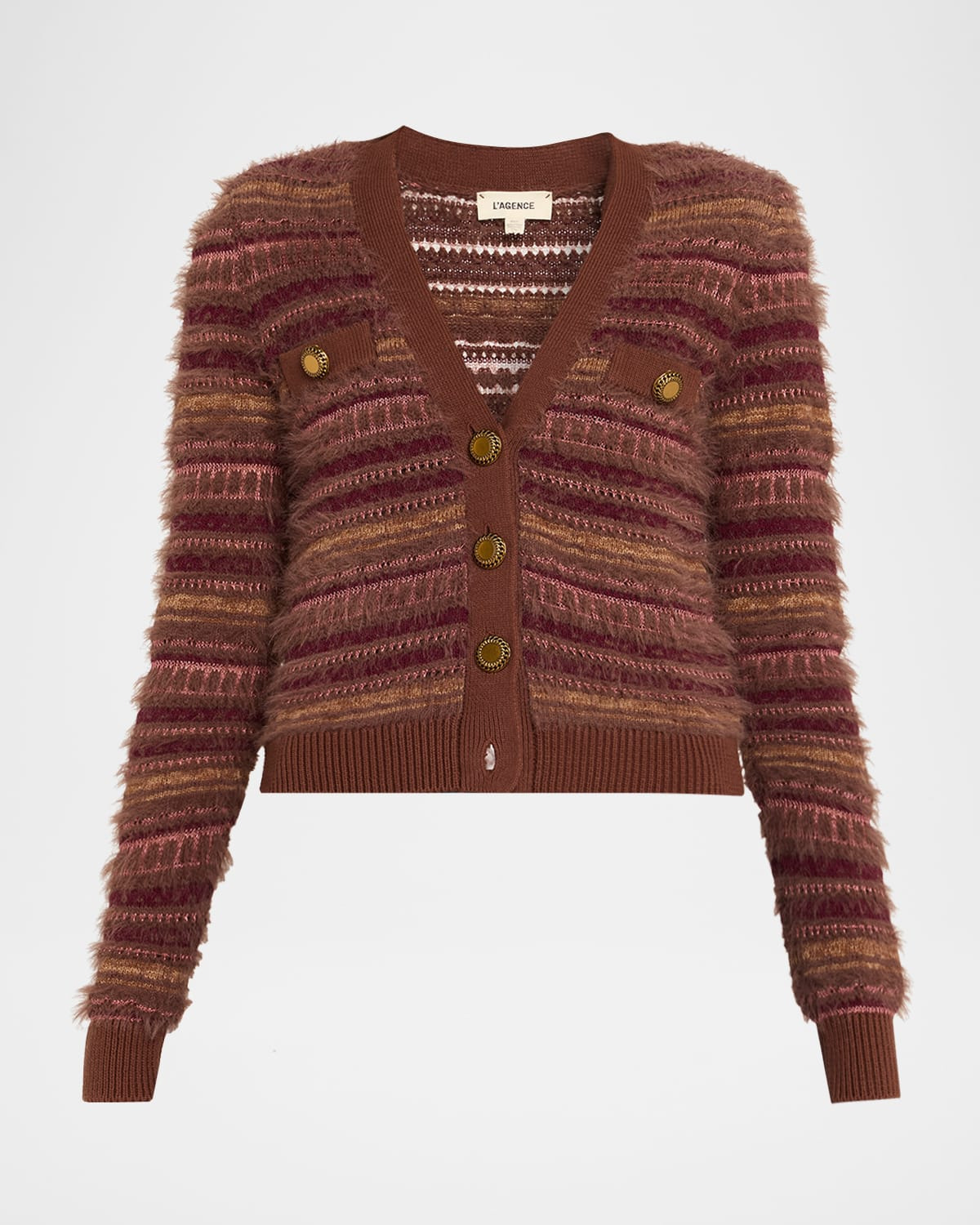 - L'Agence "Ariadne" cardigan crafted from a cotton-blend mixed striped design - V neckline; button front - Long sleeves - Chest welt pockets - Classic fit - Hip length - Ribbed cuffs and hem - Cotton/nylon/polyamide/viscose - Imported