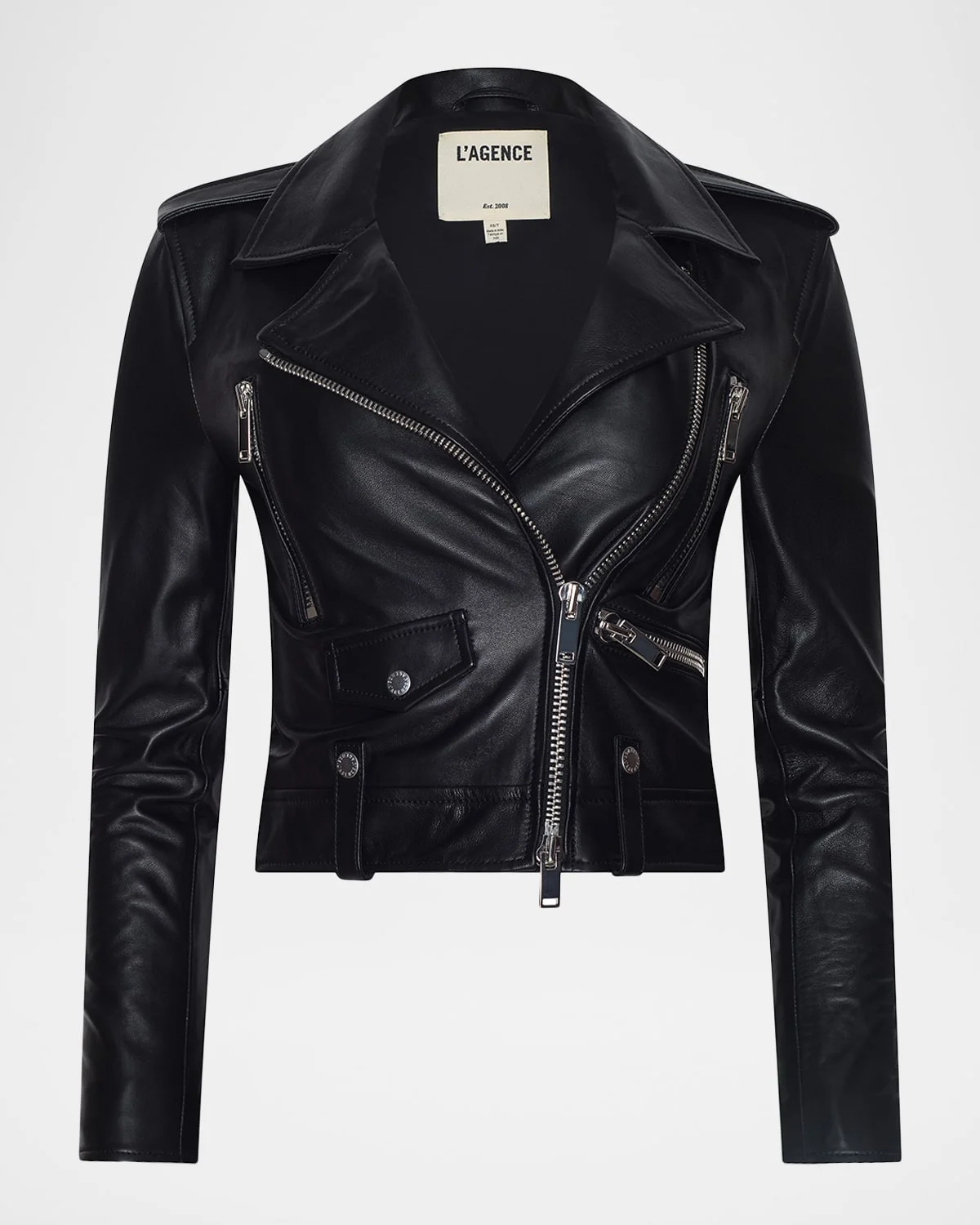 Designed in midweight lambskin leather, the "Blakely" jacket by L'Agence features classic moto detailing Approx. 19.1"L from shoulder to hem Notched lapels; asymmetric zip front Long sleeves; zip cuffs Zip pockets Slim fit Slightly cropped hem Leather Leather method dry cleaning Imported