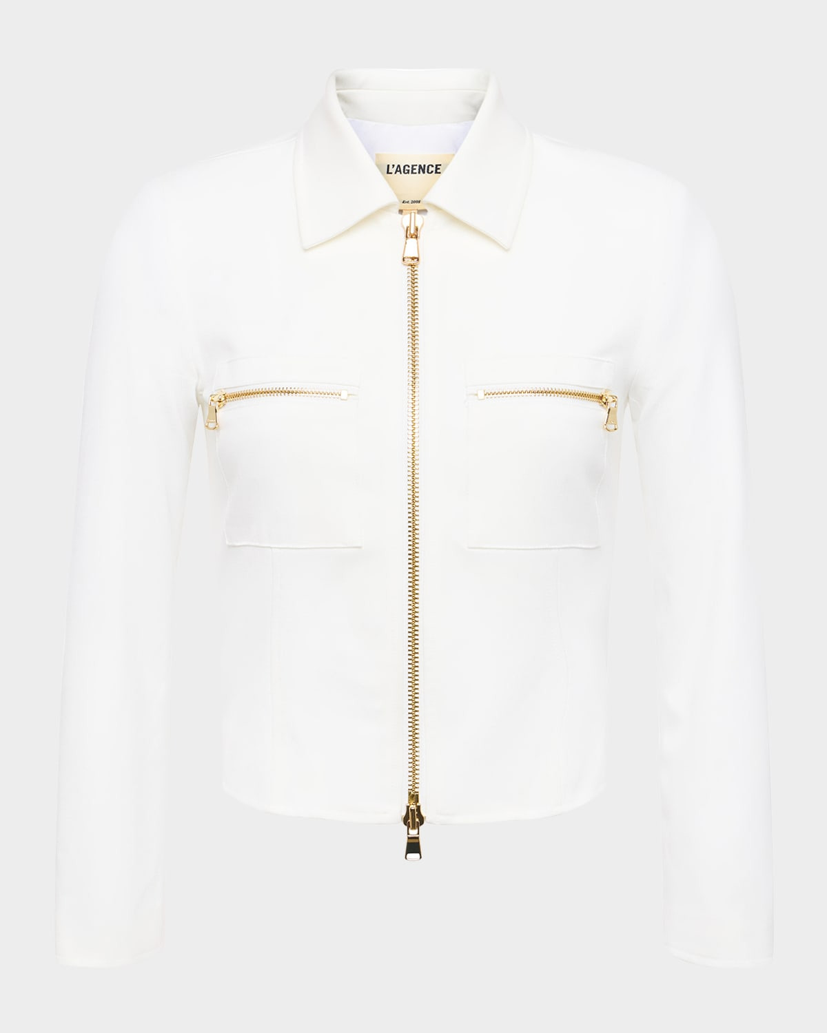 - L'Agence "Calianna" structured shacket finished with gold-tone hardware - Spread collar - Long sleeves; zip cuffs - Zipped chest patch pockets - Slim fit - Hip length - Two-way zip front closure - Polyester/rayon/cellulose acetate/spandex - Dry clean - Imported
