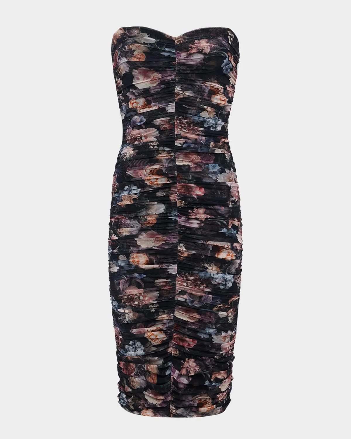 L'Agence "Caprice" floralprinted dress in an allover ruched construction Strapless neckline Sleeveless Centerback vented hem Hem falls below the knee Sheath silhouette Nylon/polyamide/spandex Dry clean Imported