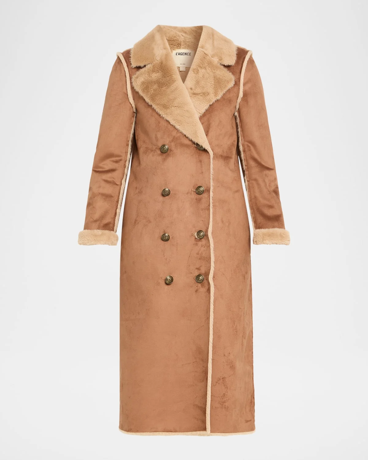 L'Agence "Citron" faux fur (polyester) maxi coat Notched collar; doublebreasted front Long sleeves Side seam pockets Vented back Hem falls below the knee Straight silhouette Polyester Dry clean Imported