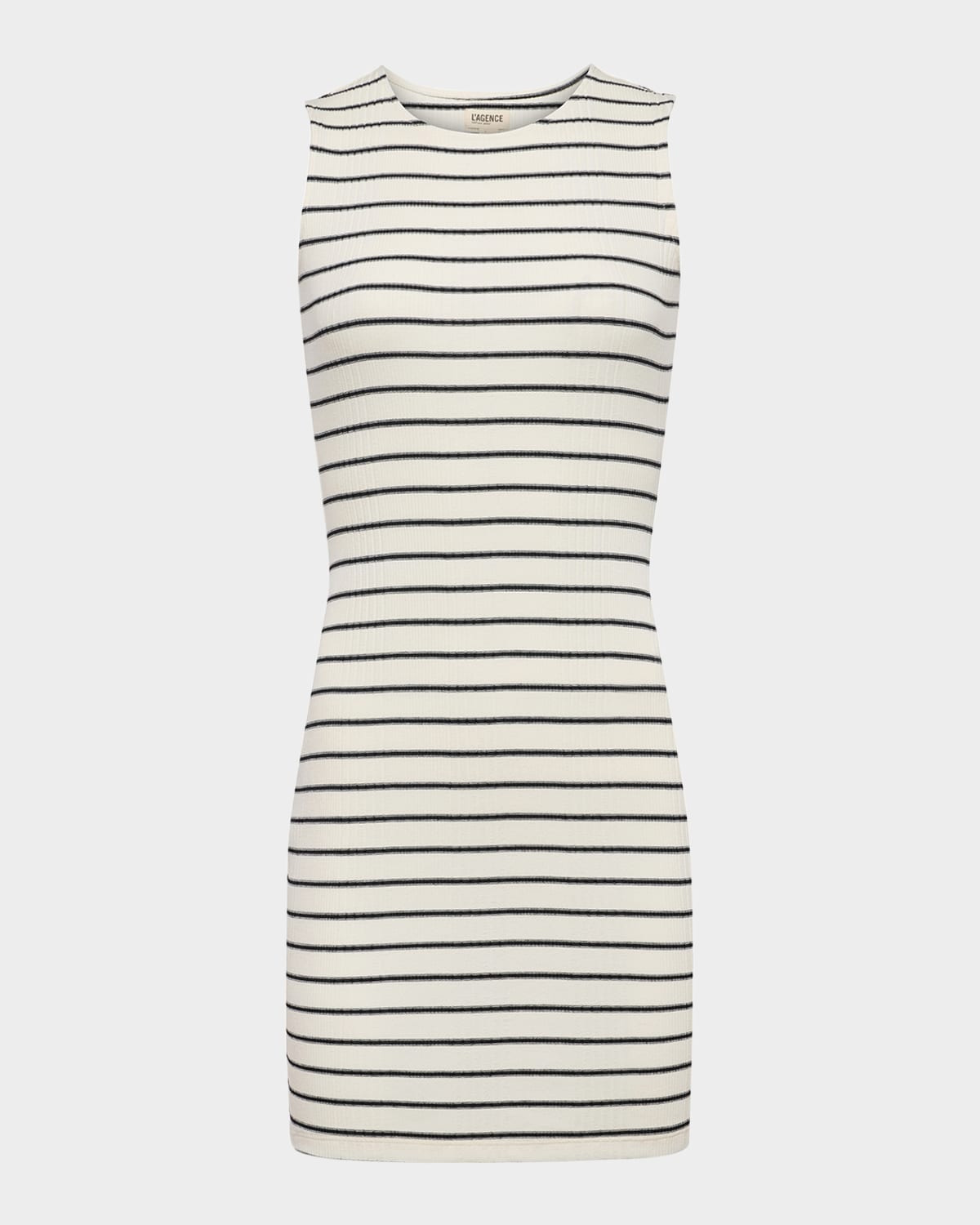 - L'Agence "Ellis" stripe mini dress in ribbed-knit - Crew neckline - Sleeveless - Figure-hugging silhouette - Hem falls above the knee - Slipover style - Cotton/modal/spandex - Made in USA