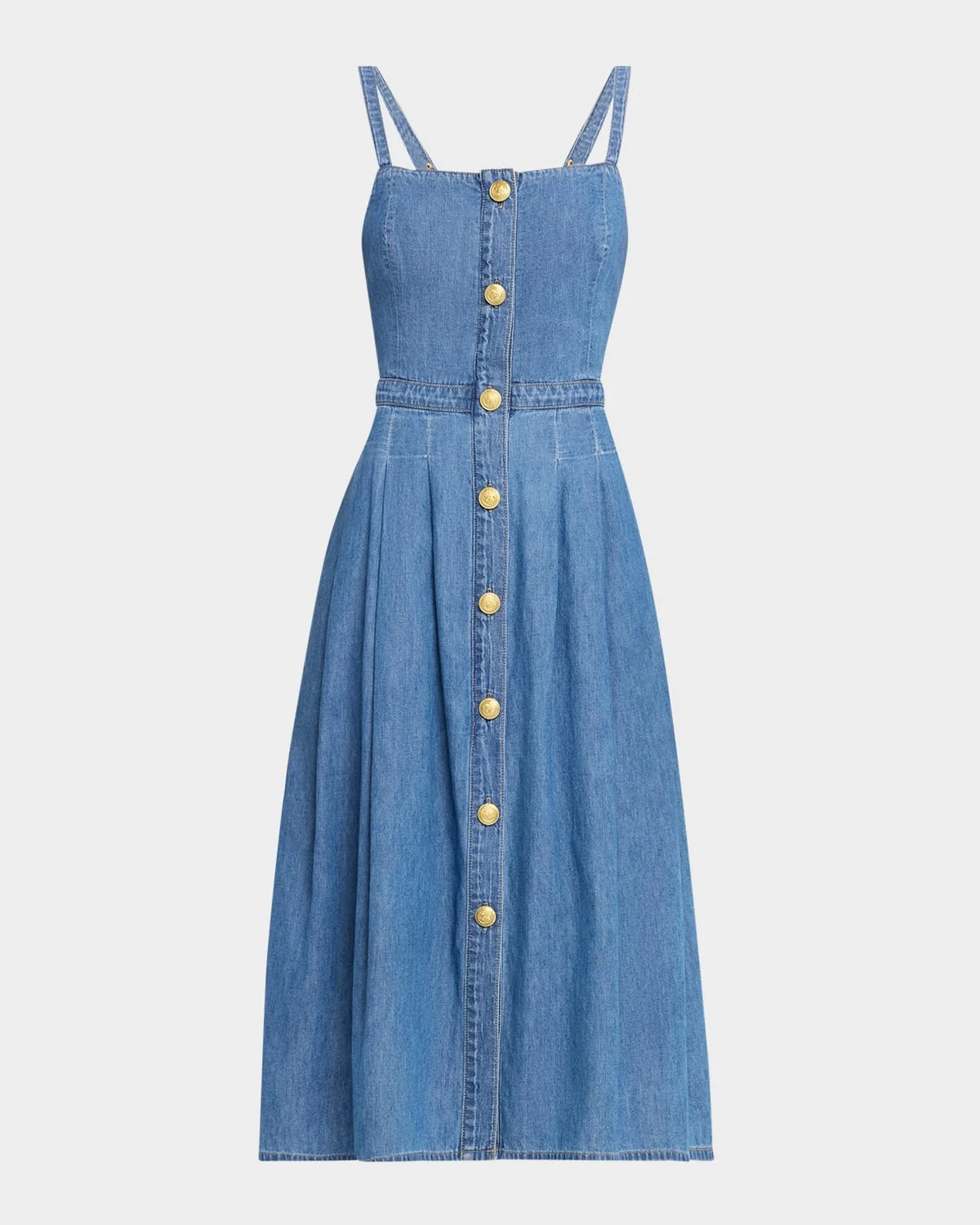 - L'Agence "Esmeralda" denim midi dress finished with embossed gold-tone buttons - Square neckline - Adjustable straps - Side seam pockets - A-line silhouette - Hem falls below the knee - Exposed back zip - Cotton - Made in USA