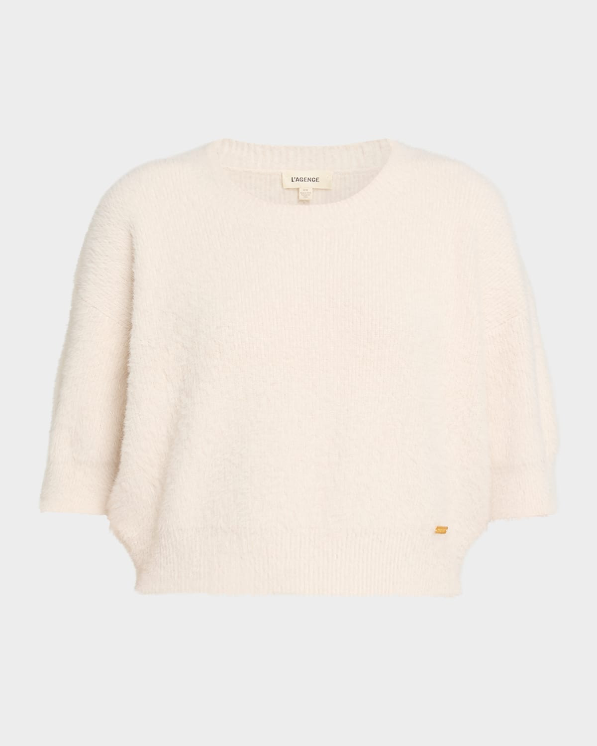 Perfect for transitioning between seasons, the "Guinevere" ultrasoft knit sweater by L'Agence is framed with abbreviated sleeves Crew neckline Elbowlength puff sleeves Cropped length Relaxed fit Pullover style Amni® nylon Imported