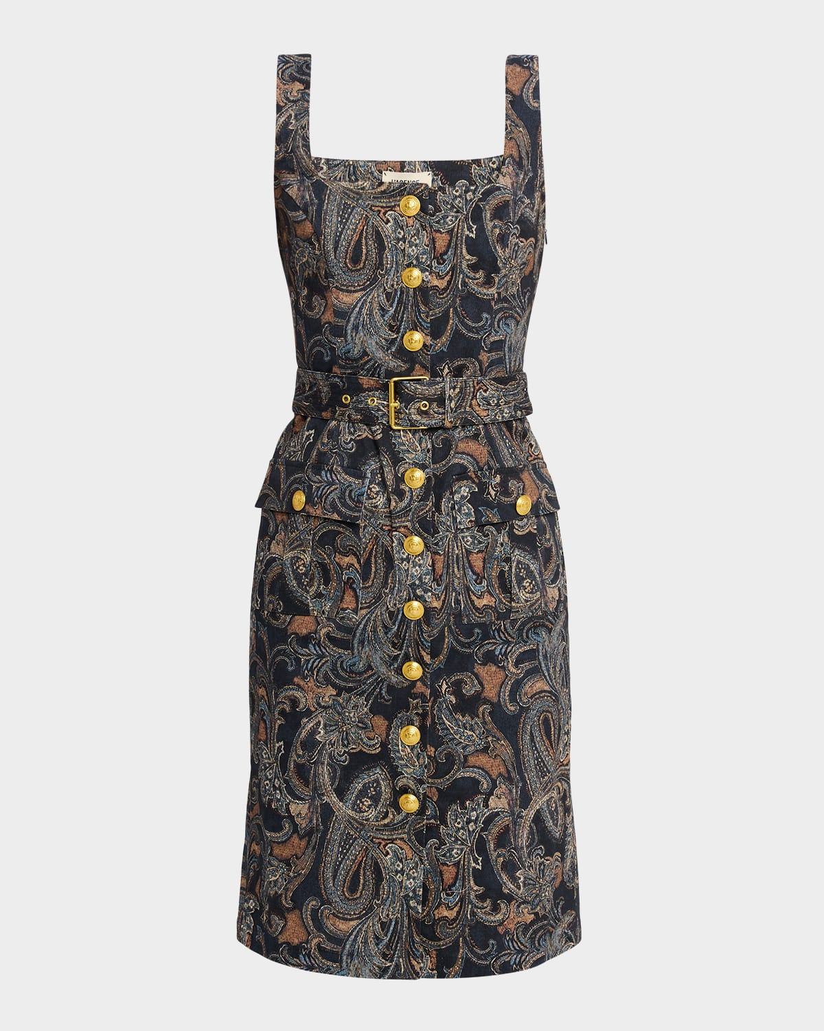 Featuring an allover paisley print in stretch cotton, the "Idy" midi dress by L'Agence is a timeless silhouette with an adjustable belt to cinch the waist and flatter the figure. Square neckline Sleeveless Hip flap pockets Sheath silhouette Hem falls below the knee Buttonfront Cotton/Lycra xfit® spandex Dry clean only Imported