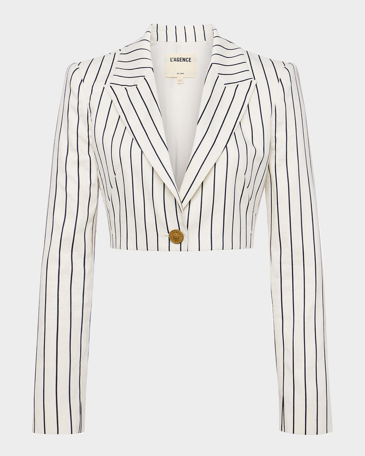 - L'Agence "Izzie" abbreviated blazer in a classic striped design with sailor button finishes - Peak lapels - Padded shoulders - Long sleeves; button cuffs - Tailored fit - Cropped hem - Single-breasted front - Linen/rayon/cellulose acetate/cotton - Imported