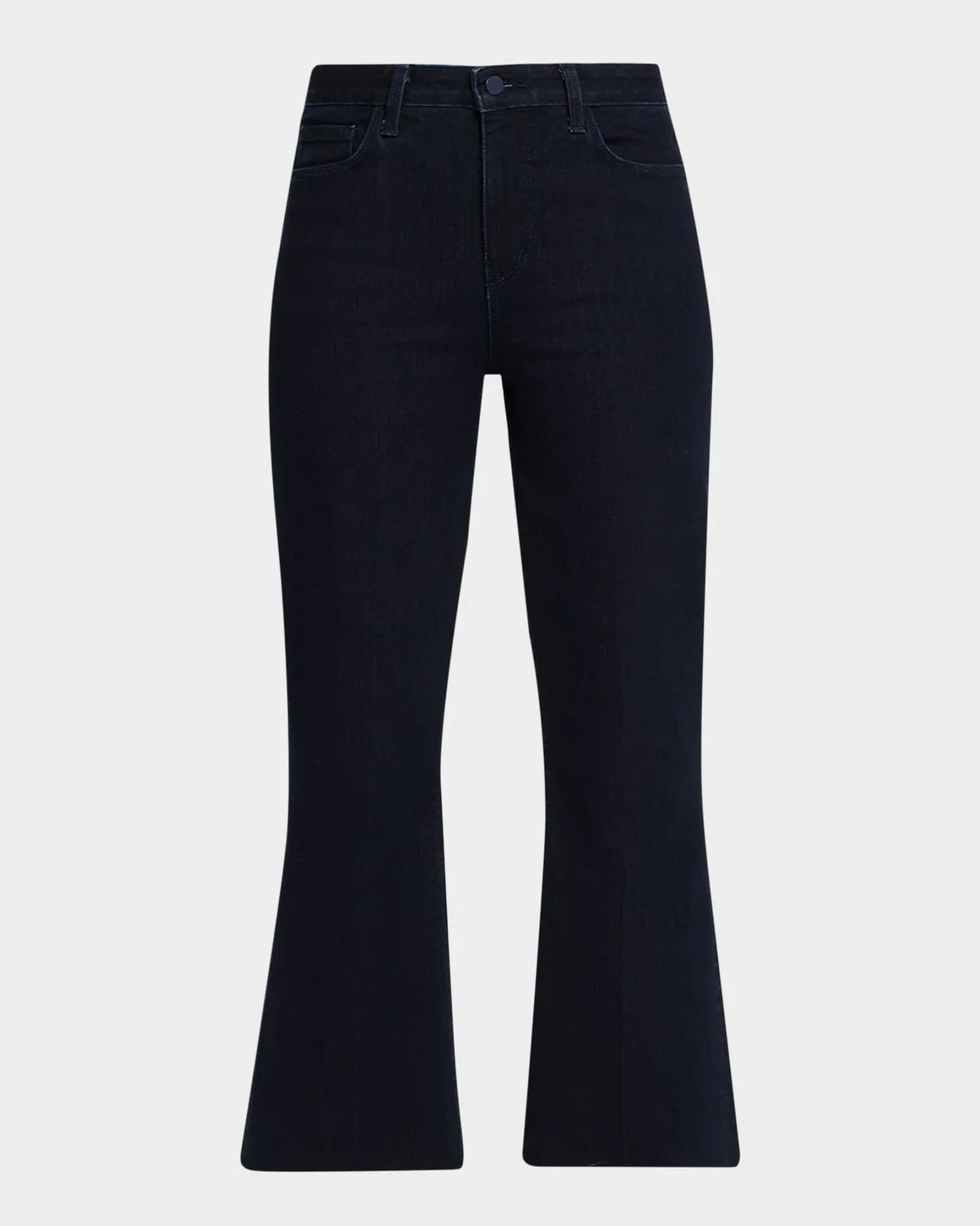 L'Agence "Kendra" kickflare jeans featuring a raw hem in faded darkwash denim High rise Fivepocket style Fitted through the hip and thigh Cropped length Button/zip fly; belt loops Cotton/polyester/spandex Made in USA