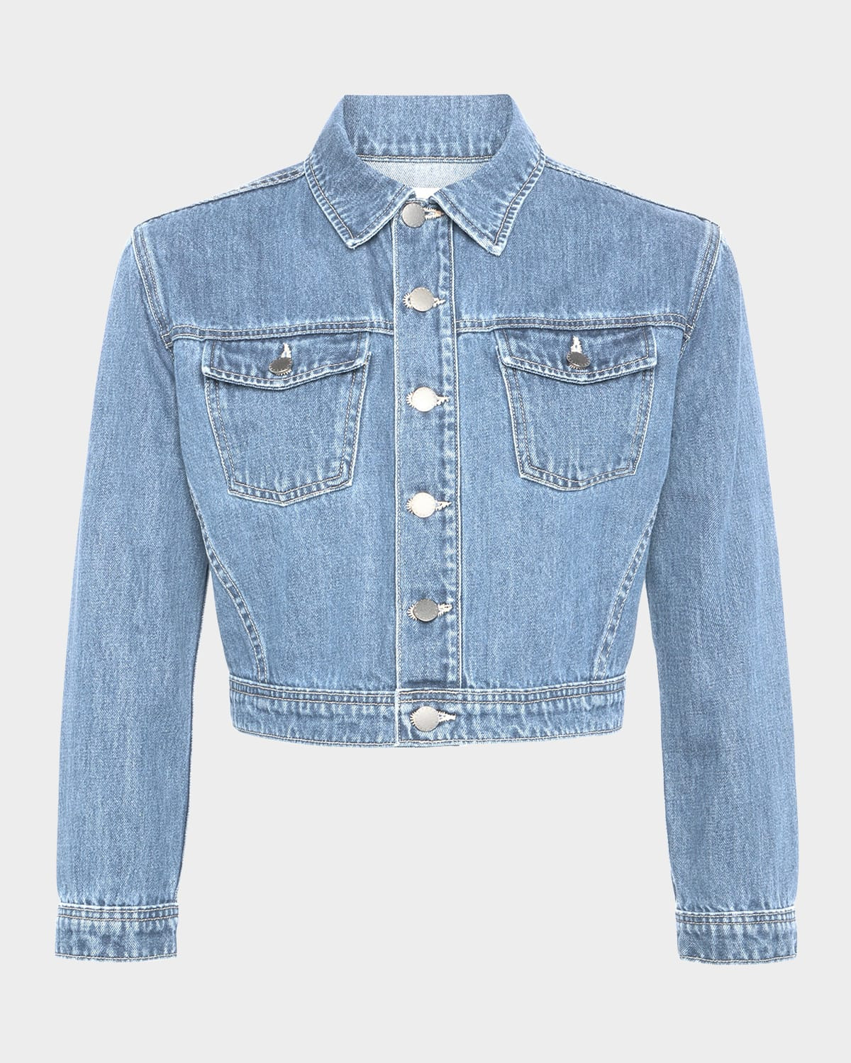 - L'Agence "Koda" denim jacket - Point collar - Long sleeves with button cuffs - Dual chest pockets - Cropped fit - Hem sits at the hip - Button-front - Cotton - Made in USA - Model is 5'10"/177cm.