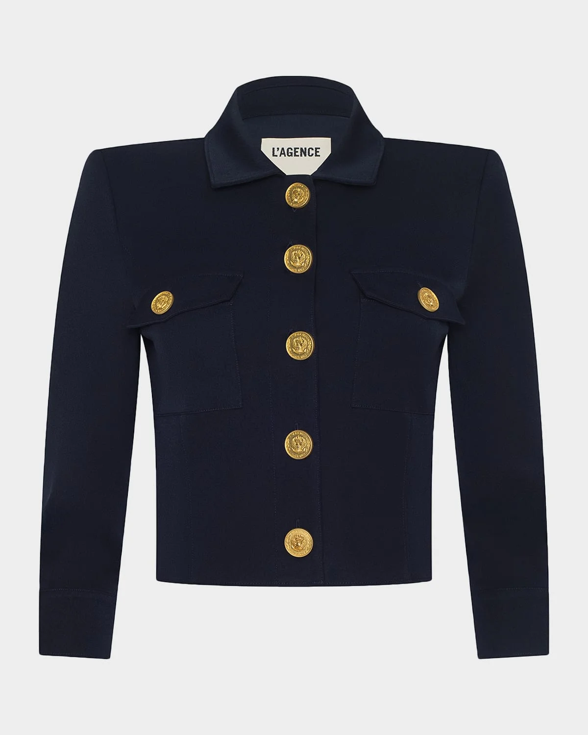 L'Agence "Kumi" jacket crafted from a supple stretchsuiting fabrication and finished with signature golden embosseddome buttons Spread collar; button front Strong shoulders Dual buttonflap pockets 3/4 sleeves with button cuffs Cropped hem Fitted Polyester/spandex Imported