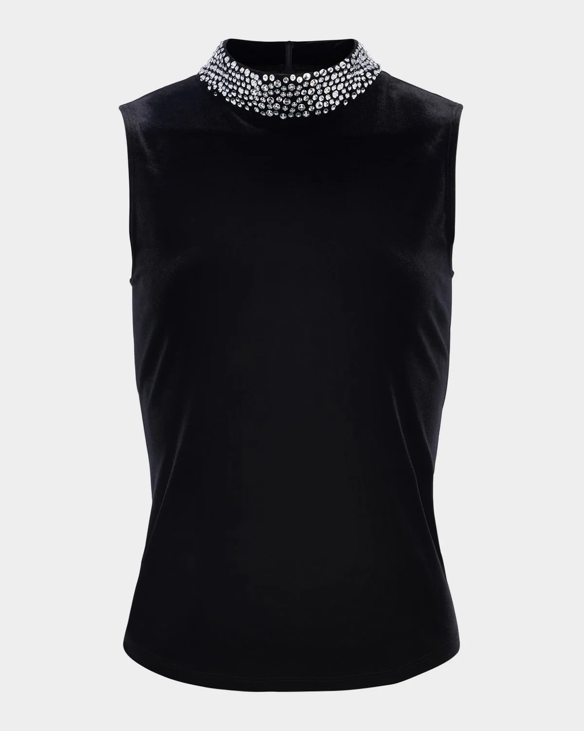 L'Agence "Madelyn" top featuring a rhinestone embellished mock neckline Sleeveless Fitted Hem falls to the hip Invisible back zip Cotton Made in USA