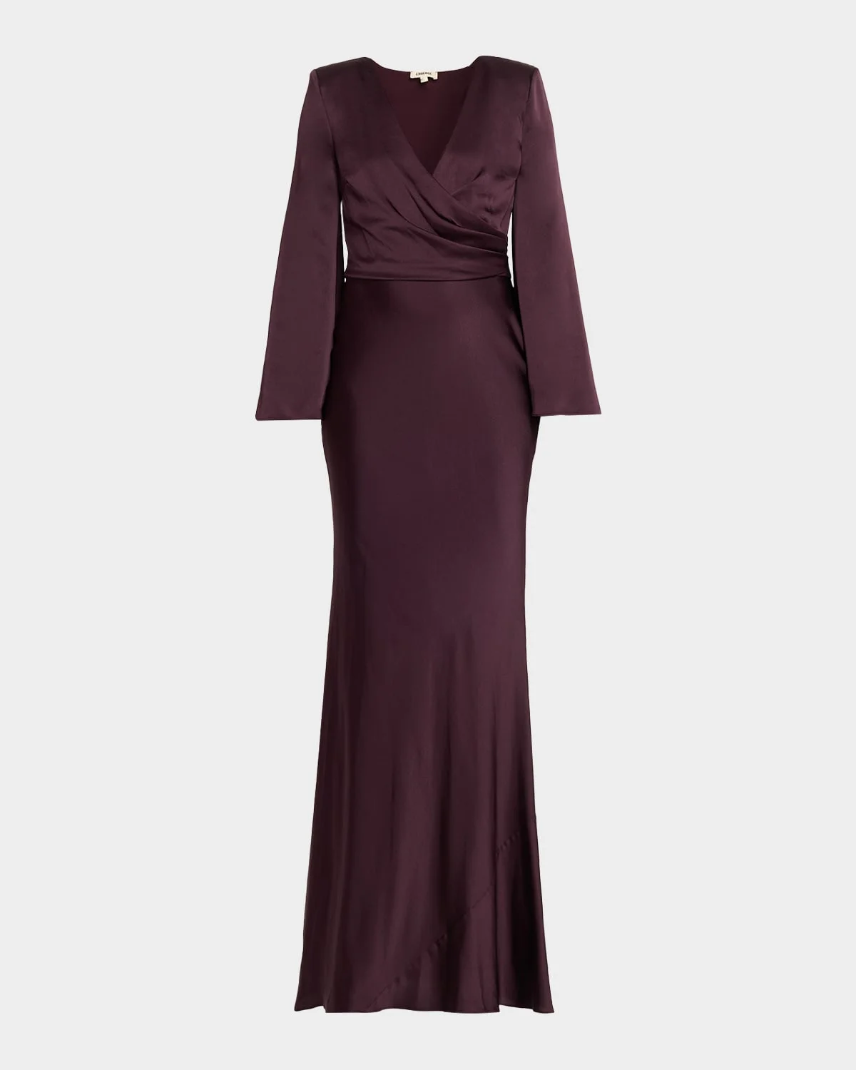 Cut from lustrous satin, the "Manon" dress by L'Agence features a plunging wrap neckline and a floorsweeping silhouette Approx. 61.3"L from shoulder to hem Surplice neckline Padded shoulders Relaxed long sleeves Full length Bodyskimming silhouette Polyester Imported