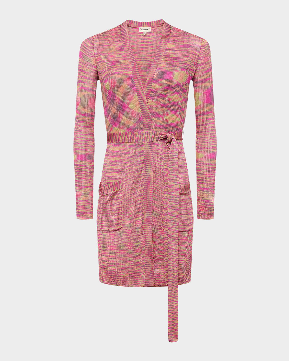 - L'Agence "Neve" space-dye cardigan finished with a self-tie belt - V neckline - Long sleeves - Patch pockets - Classic fit - Mid-thigh length - Open front - Promodal® rayon - Dry clean - Imported
