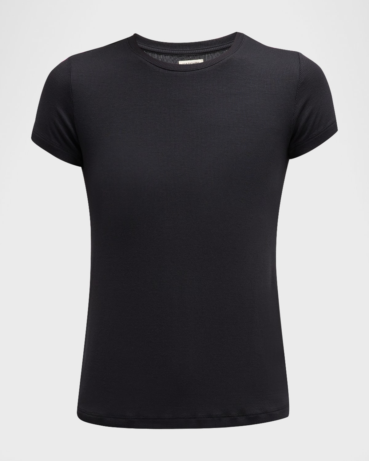 - L'Agence "Ressi" classic tee - Crew neckline - Short sleeves - Fitted silhouette - Hem sits at the hip - Pullover style - Rayon/cellulose acetate/spandex - Made in USA - Model is 5'10"/177cm.