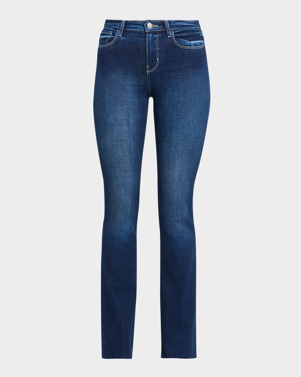 L'Agence "Ruth" straightleg jeans with a raw hem in darkwash denim Fivepocket style High rise Slim fit Full length Button/zip fly; belt loops Cotton/polyester/spandex Made in USA