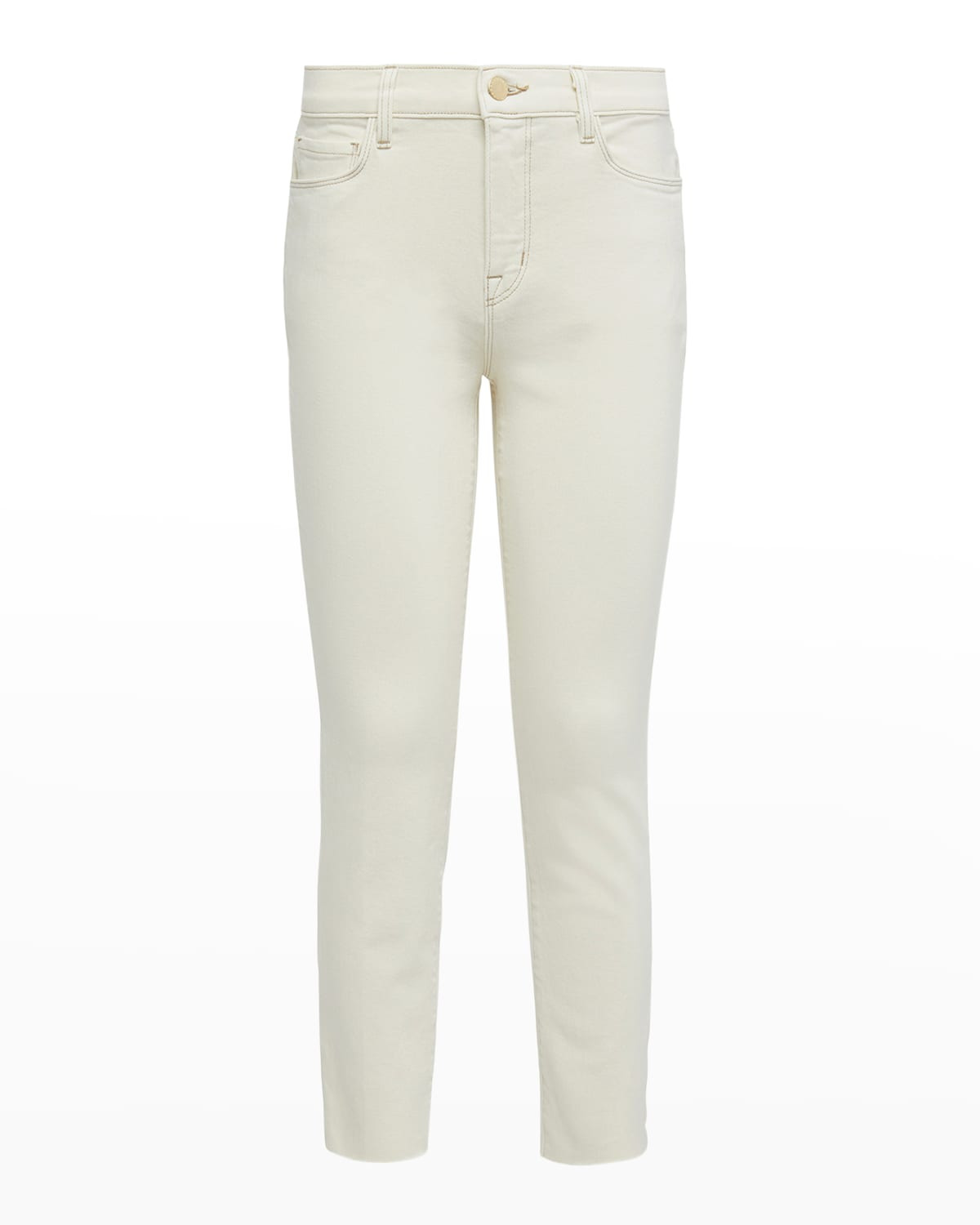 L'Agence "Sada" cropped slimfit jeans in stretch denim finished with raw hems and contrast stitching Approx. 26" inseam Cropped fit High rise Fivepocket style Straight legs Button/zip fly; belt loops Cotton/polyester/spandex Dry clean Made in USA
