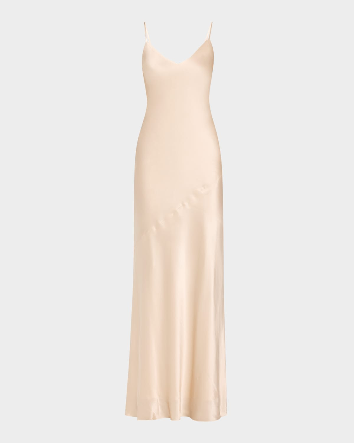 L'Agence "Serita" slip dress in silk charmeuse. V neckline. Adjustable spaghetti straps. Maxi length. Pullover style. Silk. Dry clean. Imported.
