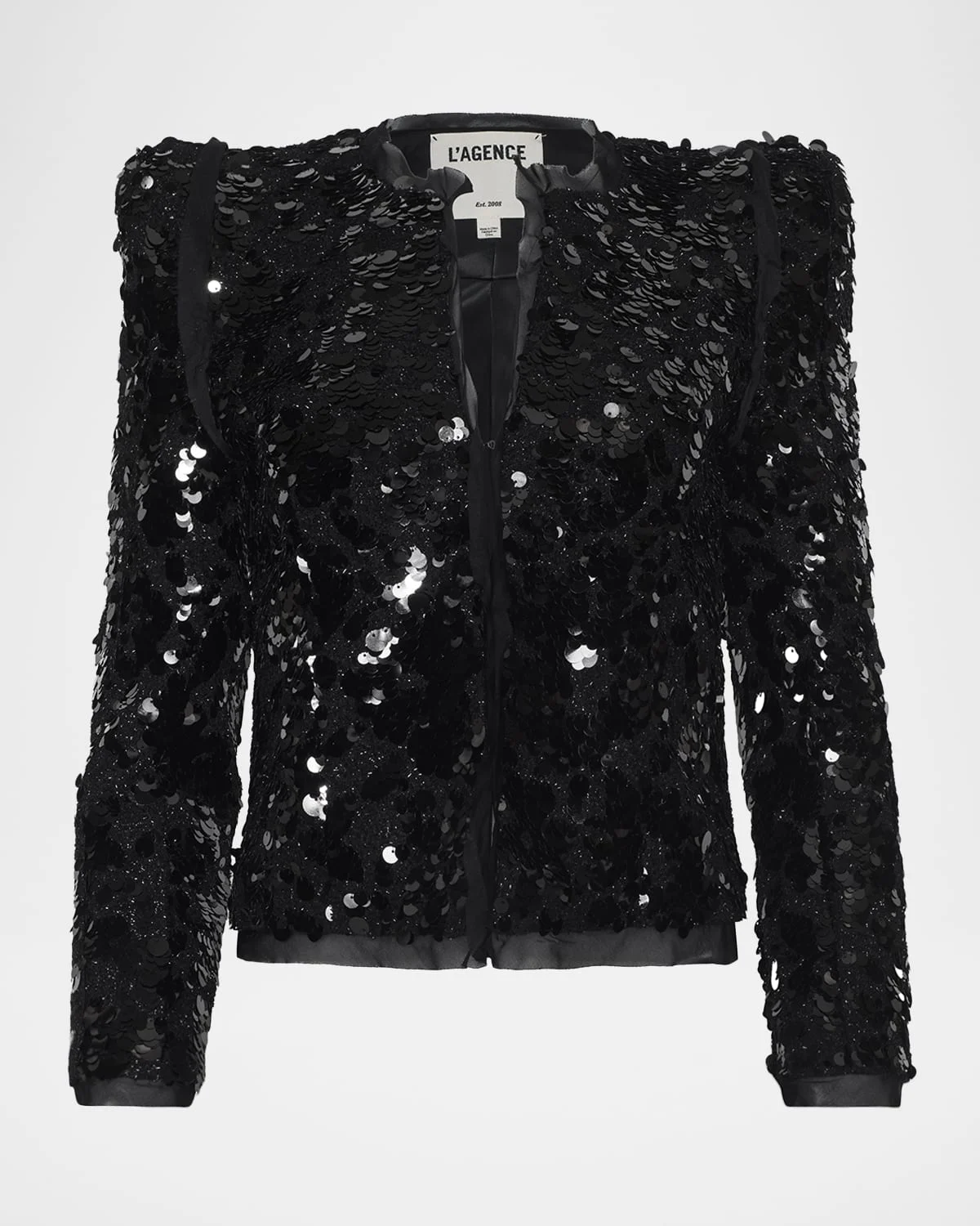 Designed in metallic tweed with shimmering paillette sequins, the "Shai" jacket L'Agence features tonal chiffon trim Approx. 20.5"L from shoulder to hem Collarless neckline Strong padded shoulders Long sleeves Slightly copped hem Hookandeye front closure Polyester Hand wash Imported