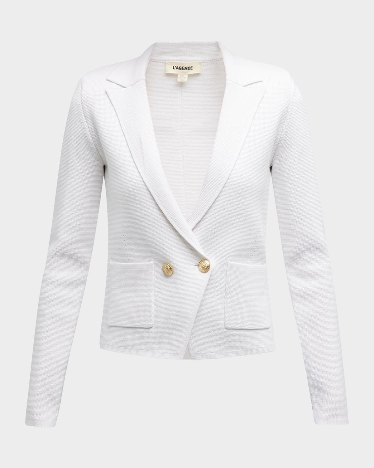 L'Agence "Sofia" texturedknit doublebreasted blazer Notched lapels Long sleeves Patch pockets Slim fit Cutaway hem Single button closure Cotton/acrylic/nylon Dry clean Imported