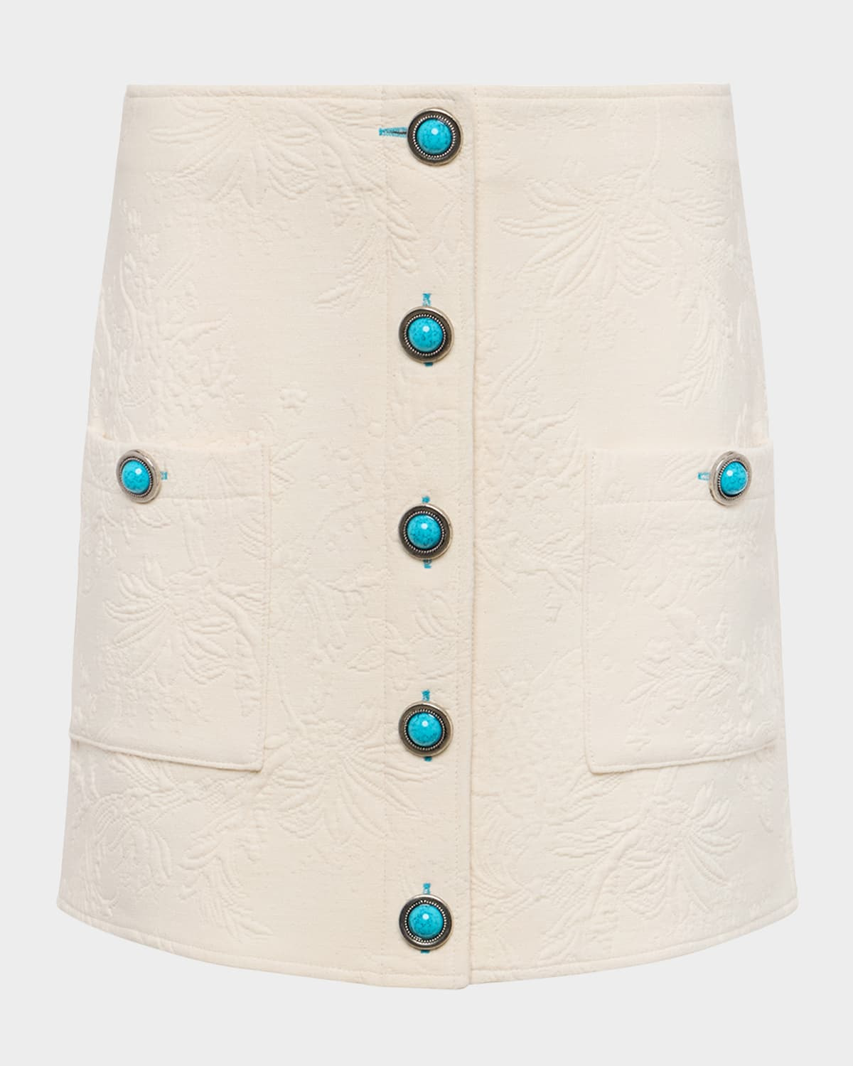 - L'Agence "Truman" floral-embossed skirt complete with an imitation turquoise button front - High rise - Front buttoned patch pockets - Hem falls above the knee - A-line silhouette - Invisible back zipper - Cotton - Dry clean - Imported